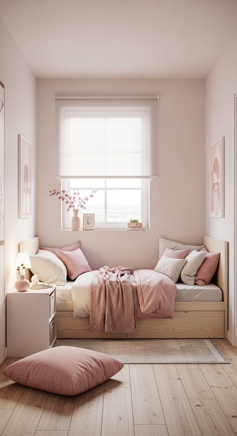A minimal furniture layout is essential in a small bedroom. Start by keeping only what you truly need, such as a bed, a small storage unit, and maybe a compact desk. This immediately frees up space and makes the room feel more open.Add pink through small accents like cushions, a throw blanket, or a single piece of artwork. This keeps the color present without overwhelming the room. Choose items that are both functional and decorative.Use multifunctional furniture, such as a bed with built in storage, to reduce clutter. Keep surfaces clean and organized to maintain a sense of calm.This idea focuses on simplicity and balance. It shows that you do not need a lot of pink to create a beautiful space, just the right touches placed thoughtfully.