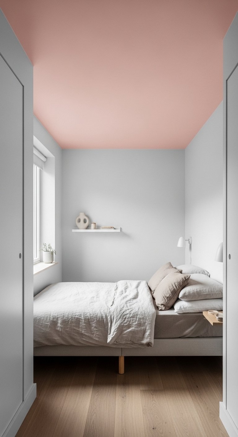 A soft pink ceiling can make your bedroom feel taller without changing your walls. Most people ignore the ceiling, but in a small space, it plays a big role in how open the room feels. Choose a very light blush pink so it reflects light instead of making the room feel closed.Keep your walls in white or pale neutral shades so the ceiling becomes a gentle focal point. This draws the eye upward and creates a sense of vertical space. Pair this look with simple lighting like a small white pendant or a flush mount fixture to avoid visual heaviness.Avoid dark furniture that pulls attention downward. Instead, use light tones and minimal decor to keep the space balanced. This idea adds a unique twist to small pink bedroom ideas while helping your room feel taller, softer, and more visually interesting.