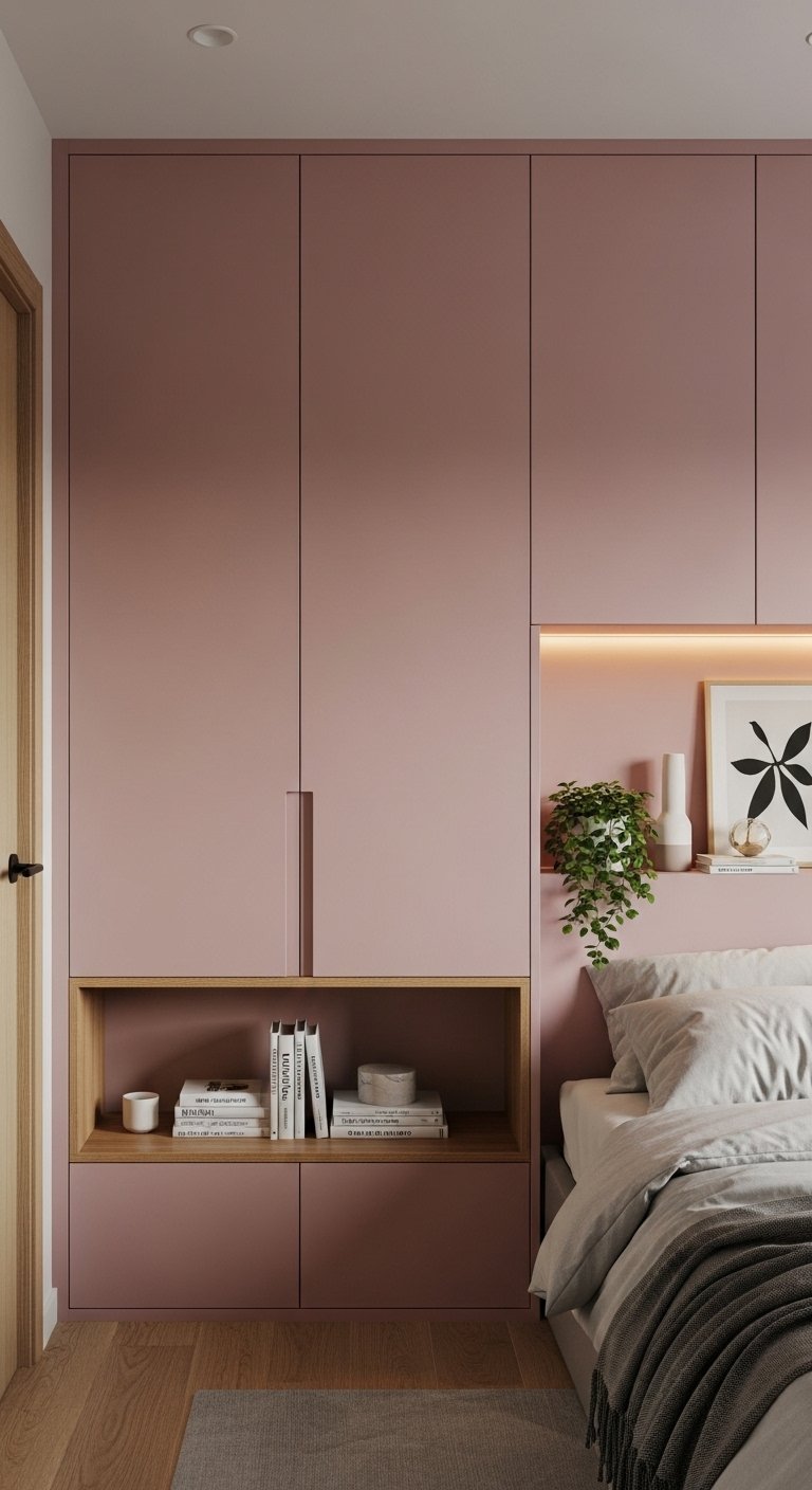 Built in storage painted in soft pink can help you save space while keeping the room looking seamless. Instead of using bulky wardrobes, opt for wall fitted cabinets that blend into the room. Choose a muted pink tone that matches your overall palette.Keep the design simple with flat panels and minimal handles to avoid visual clutter. This creates a smooth wall effect that makes the room feel larger. Use the storage to hide everyday items so surfaces stay clean and open.Pair the cabinets with light walls and flooring to maintain brightness. You can also add a small open shelf section for decor like books or plants.This idea combines function and style, making your bedroom look organized and spacious while still embracing soft pink tones in a modern way.