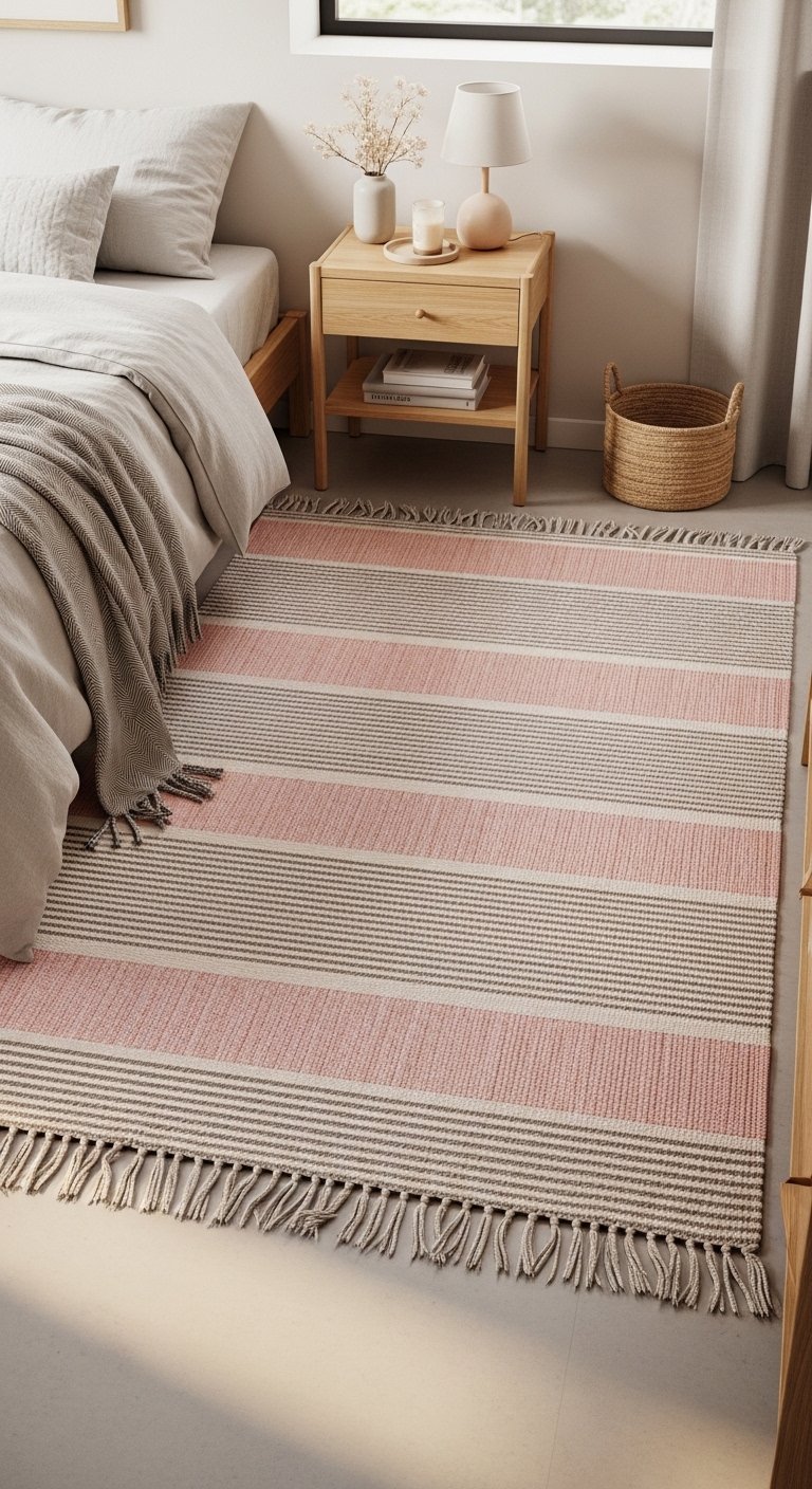 A striped rug in soft pink and neutral tones can visually stretch your floor area. Horizontal stripes make the room feel wider, while vertical stripes can make it appear longer. Choose the direction based on your room layout.Stick to light shades like blush, cream, and pale beige to keep the look airy. Avoid thick, heavy rugs and instead go for flat woven textures that sit lightly on the floor. This prevents the space from feeling crowded.Place the rug under your bed and let it extend outward to create a sense of flow. This helps define the sleeping area without breaking up the room visually.This simple addition can change how your space feels without moving any furniture. It is a subtle yet effective trick for making your bedroom look bigger and more balanced.