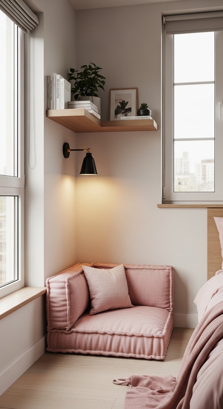 A small corner nook in pink can add charm without taking up much space. Use a compact chair or a floor cushion in soft pink fabric to create a cozy reading spot. Keep the design minimal so it does not overwhelm the room.Add a small floating shelf above the seating area for books or decor. This keeps everything off the floor and maintains an open layout. Use a soft throw or a textured cushion to add comfort without clutter.Position the nook near a window if possible so it benefits from natural light. This makes the corner feel bright and inviting rather than cramped.This idea helps you use unused space in a smart way while keeping the overall room light, functional, and visually open.