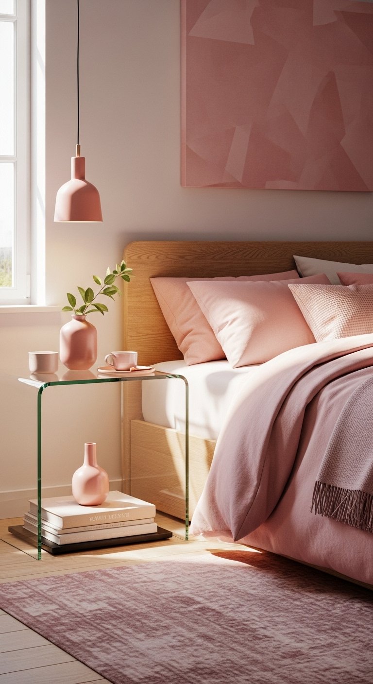 Transparent furniture, like acrylic chairs or glass side tables, works beautifully in small bedrooms. When paired with pink tones, these pieces almost disappear visually, making the room feel less crowded.Use a clear side table next to your bed instead of a solid one. This keeps the space functional without adding visual weight. Pair it with soft pink bedding or decor so the color still stands out.Keep the rest of the furniture simple and light in color. The transparency allows light to pass through, which enhances the open feel of the room.This idea is modern and practical, showing how material choice can impact space just as much as color. It is a smart addition to any list of small pink bedroom ideas focused on maximizing openness.