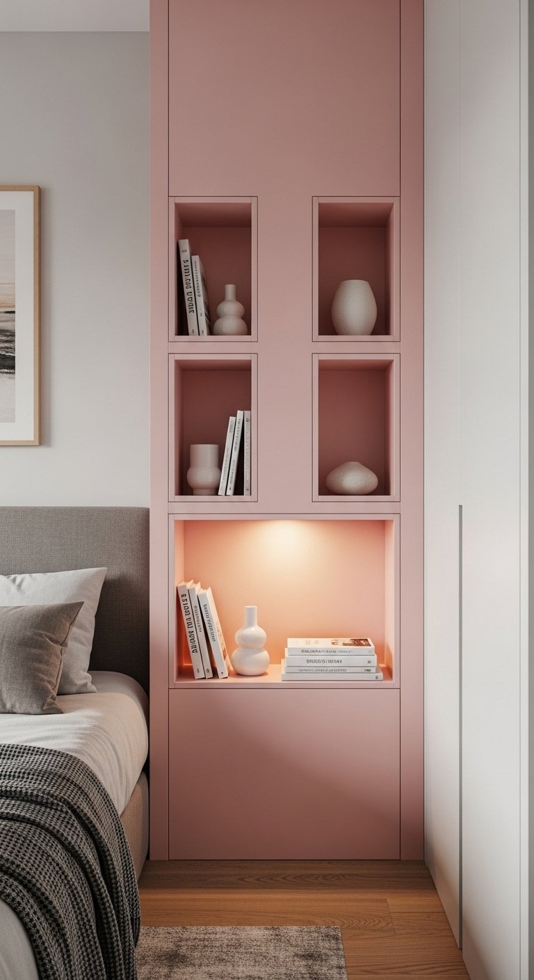 Wall niches painted in soft pink can add both storage and design without taking up extra space. Instead of adding shelves that stick out, create recessed areas in the wall to hold decor or essentials.Paint the inside of the niche in a gentle pink shade while keeping the outer wall neutral. This creates depth and draws attention without making the room feel busy.Use the niches for small items like books, candles, or decorative pieces. Keep styling minimal so it remains clean and organized.This approach adds personality while maintaining a flat wall surface, which helps the room feel larger. It is a creative way to include pink while also improving functionality in a small bedroom.