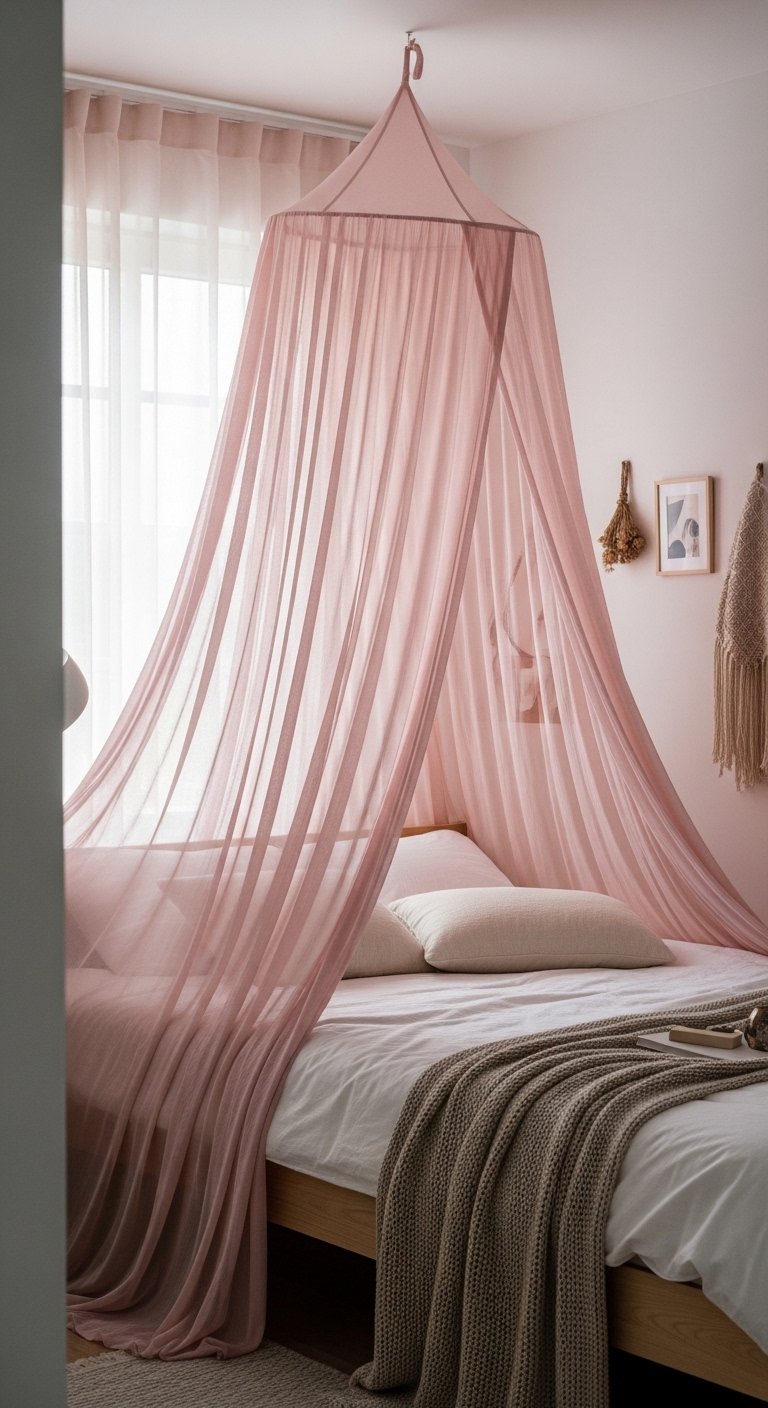 A light pink canopy can add softness and height to your bedroom without closing it in. Choose sheer fabric that allows light to pass through easily. This keeps the look airy and prevents the space from feeling heavy.Hang the canopy from the ceiling and let it fall gently around the bed. This draws the eye upward and creates a sense of vertical space. Keep the rest of the decor simple so the canopy remains the main feature.Avoid thick or dark fabrics, as they can make the room feel smaller. Stick to soft, flowing materials that move naturally.This idea adds a dreamy, cozy feel while still supporting an open layout. It is perfect if you want a romantic touch without sacrificing space.