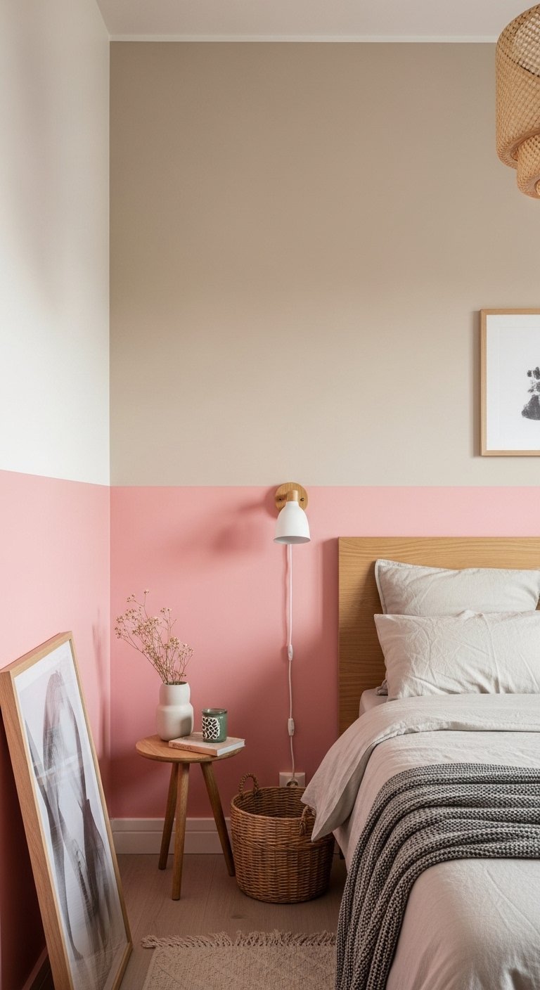 Color blocking with pink and beige can create structure while keeping the room soft and spacious. Divide your wall into two sections, with pink on the lower half and beige or off white on the upper half.This technique grounds the room while keeping the upper area light and open. It also adds visual interest without needing extra decor. Choose muted tones to maintain a calm and balanced look.Pair this with simple furniture and minimal accessories so the walls remain the focus. Use bedding that blends both colors to tie everything together.This approach gives your room a modern and organized feel while still embracing warmth and softness. It is a unique way to use color without overwhelming a small space.