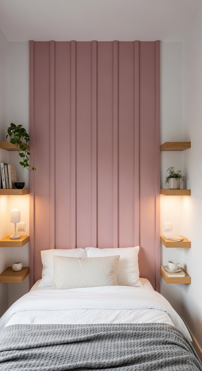 A vertical pink panel accent wall adds height and interest without crowding your room. Use a muted dusty pink tone and create slim vertical panels behind your bed. These lines naturally draw the eye upward, making the ceiling appear higher and the room feel taller.Keep the rest of the walls in soft neutral tones like off white or very light gray to maintain balance. This prevents the space from feeling enclosed. Place your bed against the accent wall to anchor the design while keeping the rest of the room simple.Instead of bulky bedside tables, install floating shelves on each side. This frees up floor space and keeps the layout open. Add small wall lights above the shelves to remove the need for table lamps.This idea blends texture, color, and smart layout in a way that enhances both style and spaciousness without adding clutter.