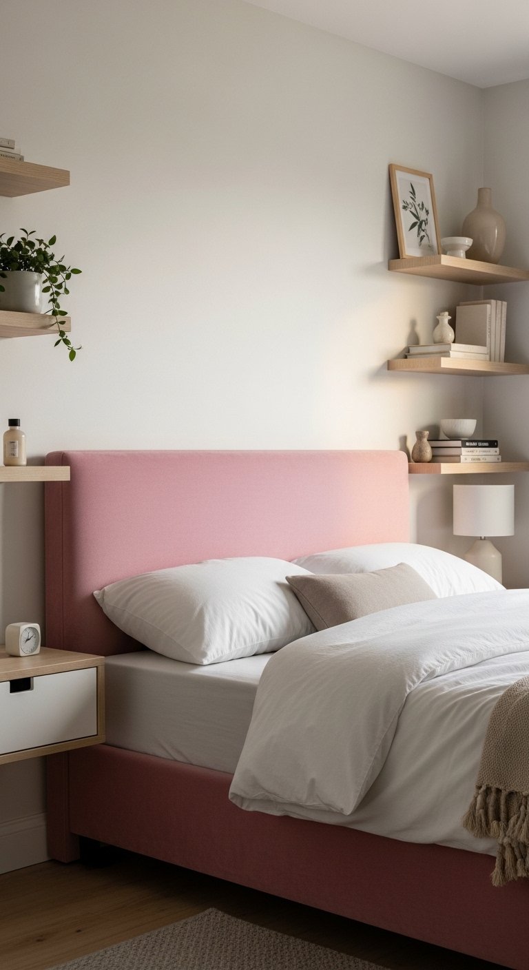 A pink upholstered headboard can act as a focal point without taking up extra space. Select a slim, low profile design in soft velvet or linen fabric. Stick to muted pink tones so the look remains calm and not overpowering.Pair the headboard with simple bedding in white or soft neutrals to keep the visual balance. Avoid oversized bed frames that make the room feel crowded. Instead, go for a streamlined structure that fits your space perfectly.Replace traditional nightstands with floating shelves to free up floor space. This creates a cleaner layout and makes the room feel larger. Add small decorative items like a plant or a minimal lamp to keep things functional yet light.This approach allows you to introduce pink in a focused way while maintaining an open and breathable bedroom design.