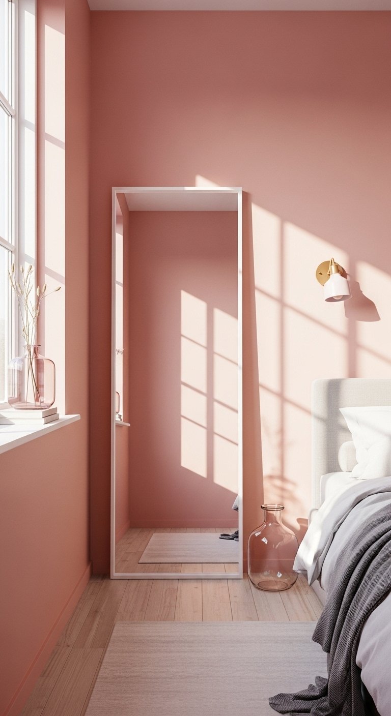 Mirrors can completely transform how spacious your bedroom feels, especially when paired with soft pink tones. Place a large mirror opposite a window so it reflects natural light across the room. This instantly brightens the space and creates the illusion of depth.Choose simple mirror designs without heavy frames to keep the look clean. You can also use mirrored closet doors to double the visual space without adding extra furniture.When pink walls or decor reflect in the mirror, they appear softer and more diffused, which enhances the airy feel of the room. Keep surrounding colors light so the reflection remains bright and uncluttered.This technique is both practical and visually effective, making your bedroom feel larger while enhancing the soft glow of pink in a natural way.