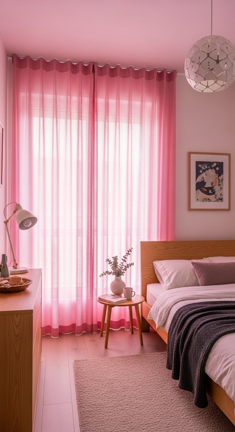 Floor to ceiling curtains can make a small bedroom feel taller and more elegant. Choose soft pink curtains in a lightweight fabric that allows light to filter through gently. This keeps the room bright while adding a subtle wash of color.Mount the curtain rod slightly above the window frame, close to the ceiling. This creates the illusion of height and makes your walls appear longer. Let the curtains fall all the way to the floor for a seamless look.If your walls are already pink, choose curtains in a slightly different shade to add depth without clashing. Keep the rest of the decor simple so the curtains remain a soft highlight rather than a heavy feature.This idea combines color and structure in a way that enhances both style and spatial perception, making your room feel more open and refined.