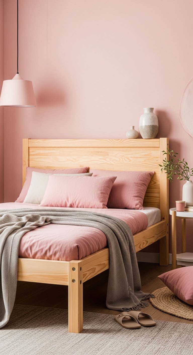 Combining pink with light wood tones creates a natural and calming environment. Use pale wood furniture like a simple bed frame, a small desk, or open shelving. These tones add warmth without making the room feel heavy.Introduce pink through smaller elements such as cushions, throws, or wall decor. This keeps the color present but not overwhelming. The mix of soft pink and natural wood creates a balanced look that feels grounded and airy.Choose furniture with slim legs so more floor space is visible. This small detail helps the room feel less crowded. Avoid dark wood, as it can make the space feel smaller.This pairing works beautifully in small bedrooms because it blends softness with structure, creating a space that feels both cozy and open.