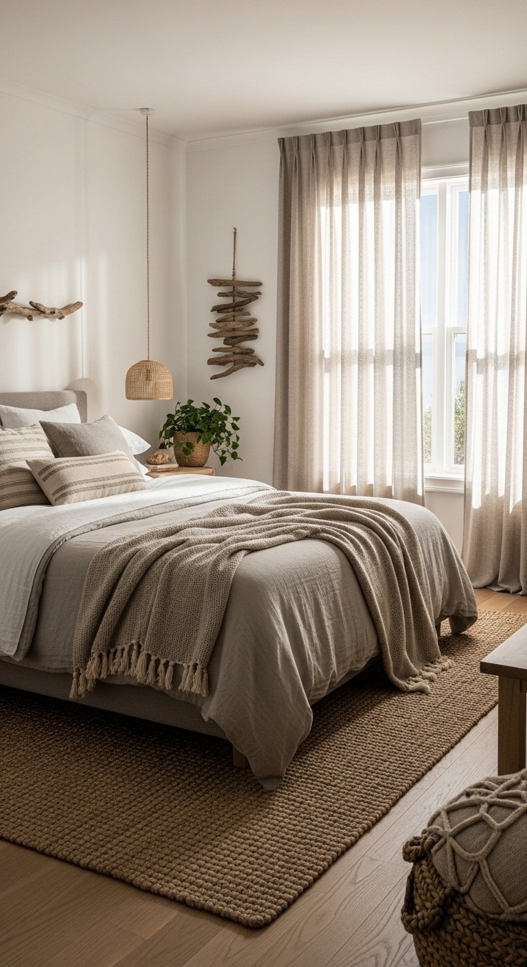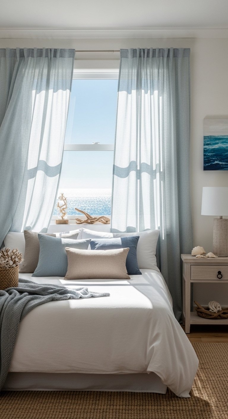 Linen curtains are a must for a light and airy coastal bedroom. Choose soft, off-white, or sand-toned fabrics that allow sunlight to filter in gently, casting a warm, diffused glow throughout the room. Linen’s natural texture adds subtle visual interest while keeping the aesthetic minimal and serene. Hang curtains high, close to the ceiling, to create the illusion of taller windows and more space. Lightweight, flowing curtains can be tied back with simple rope or natural fiber ties to reveal views or maximize light during the day. The combination of natural texture and soft illumination makes the room feel airy, fresh, and connected to the outdoors. Linen curtains are easy to maintain, eco-friendly, and perfect for a Pinterest-ready look that embodies the effortless, breezy charm of coastal living.