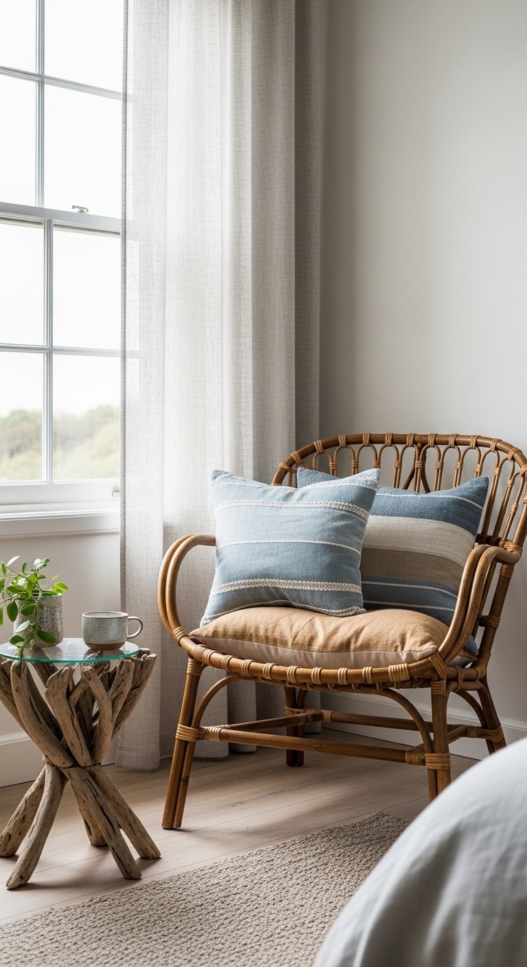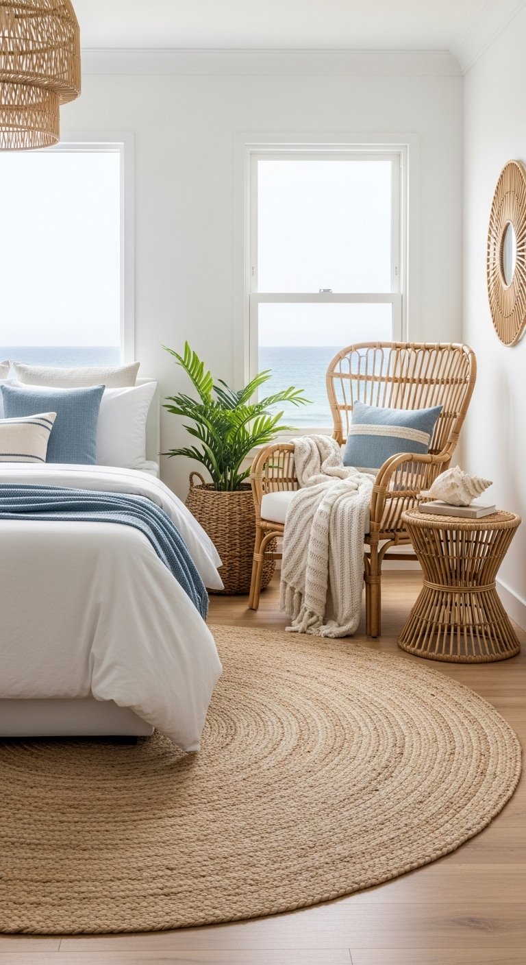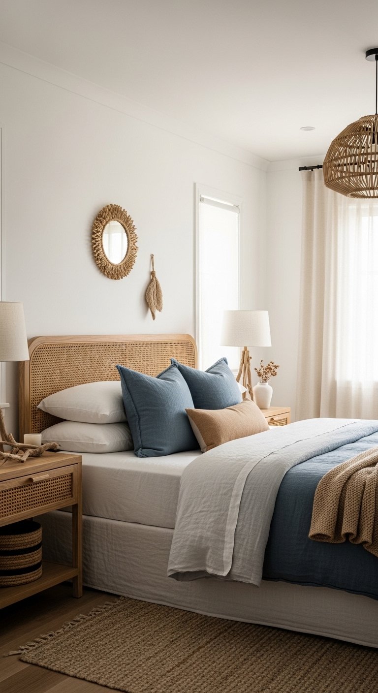 Introduce rattan furniture to bring natural texture and warmth into your coastal bedroom. Pieces like a rattan armchair, a woven bench at the foot of the bed, or nightstands with rattan panels create an inviting, organic feel without visually weighing the room down. The natural tones of rattan blend beautifully with whites, muted blues, and sandy neutrals, reinforcing a breezy, relaxed coastal vibe. Pair rattan with soft linens and cotton bedding to maintain a light and airy atmosphere. Its woven pattern introduces subtle complexity, adding dimension while staying understated. Rattan is also versatile—perfect for both traditional and modern coastal aesthetics—and complements other natural materials like driftwood or jute rugs. Using these pieces thoughtfully helps your bedroom feel curated, practical, and visually Pinterest-worthy while maintaining the effortless charm of seaside living.