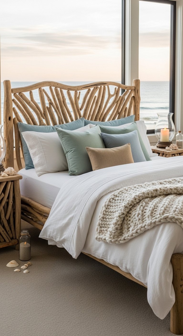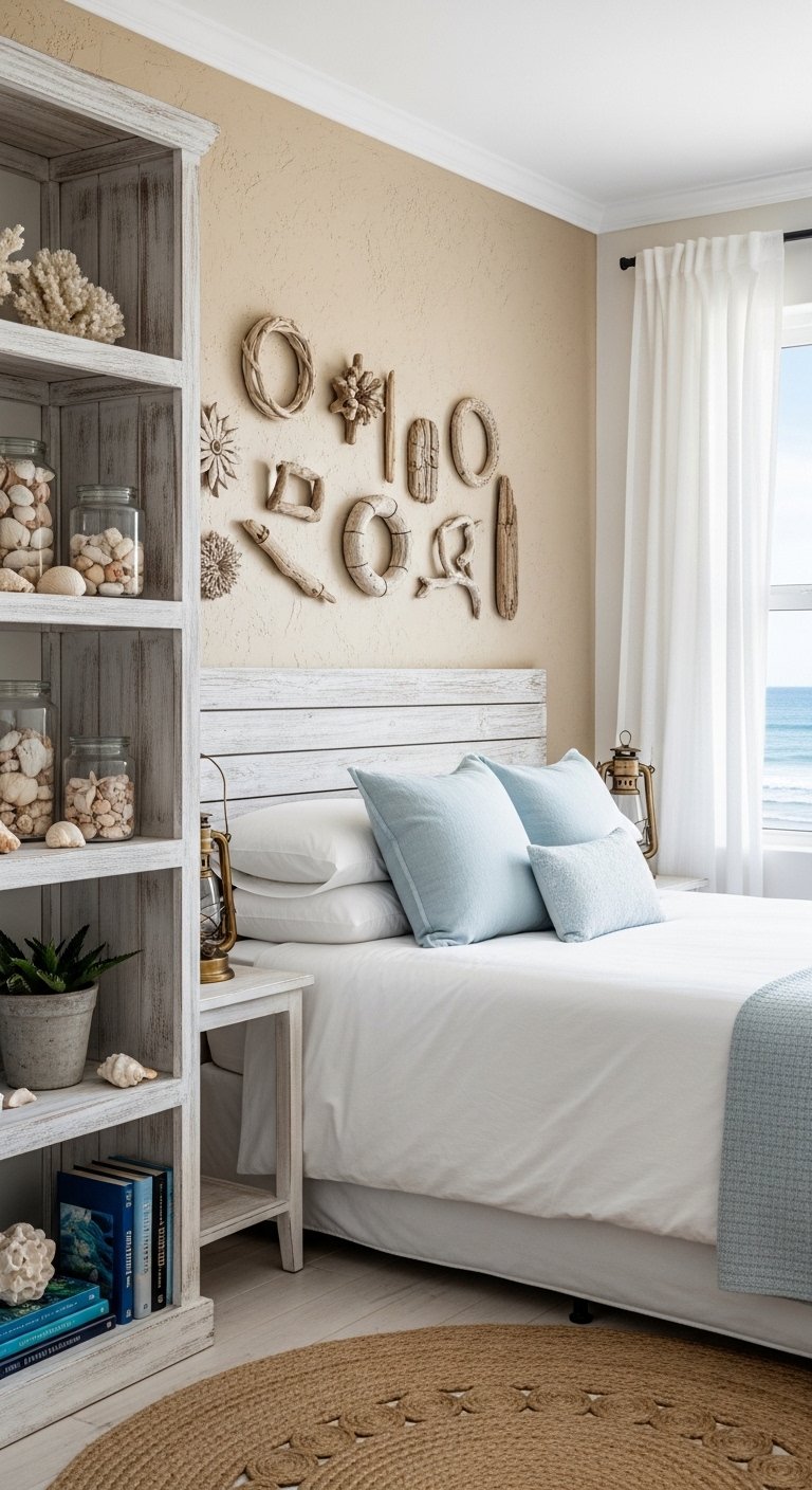 Incorporate subtle coastal décor like seashells, driftwood, and natural stones for a personal, tactile touch. Use driftwood sculptures on a dresser, seashell bowls on a nightstand, or small arrangements on floating shelves. These pieces bring the natural seaside indoors without cluttering the space. Combine with neutral tones and soft blues to maintain an airy aesthetic. Driftwood’s weathered texture and seashell’s smooth curves contrast beautifully, creating a balanced visual effect. Small accents like these are easy to rearrange seasonally, allowing fresh updates without major redesigns. When photographed or styled, they enhance Pinterest appeal with subtle yet impactful coastal storytelling. These accents contribute to an immersive coastal experience, making your bedroom feel authentic, relaxing, and connected to nature.