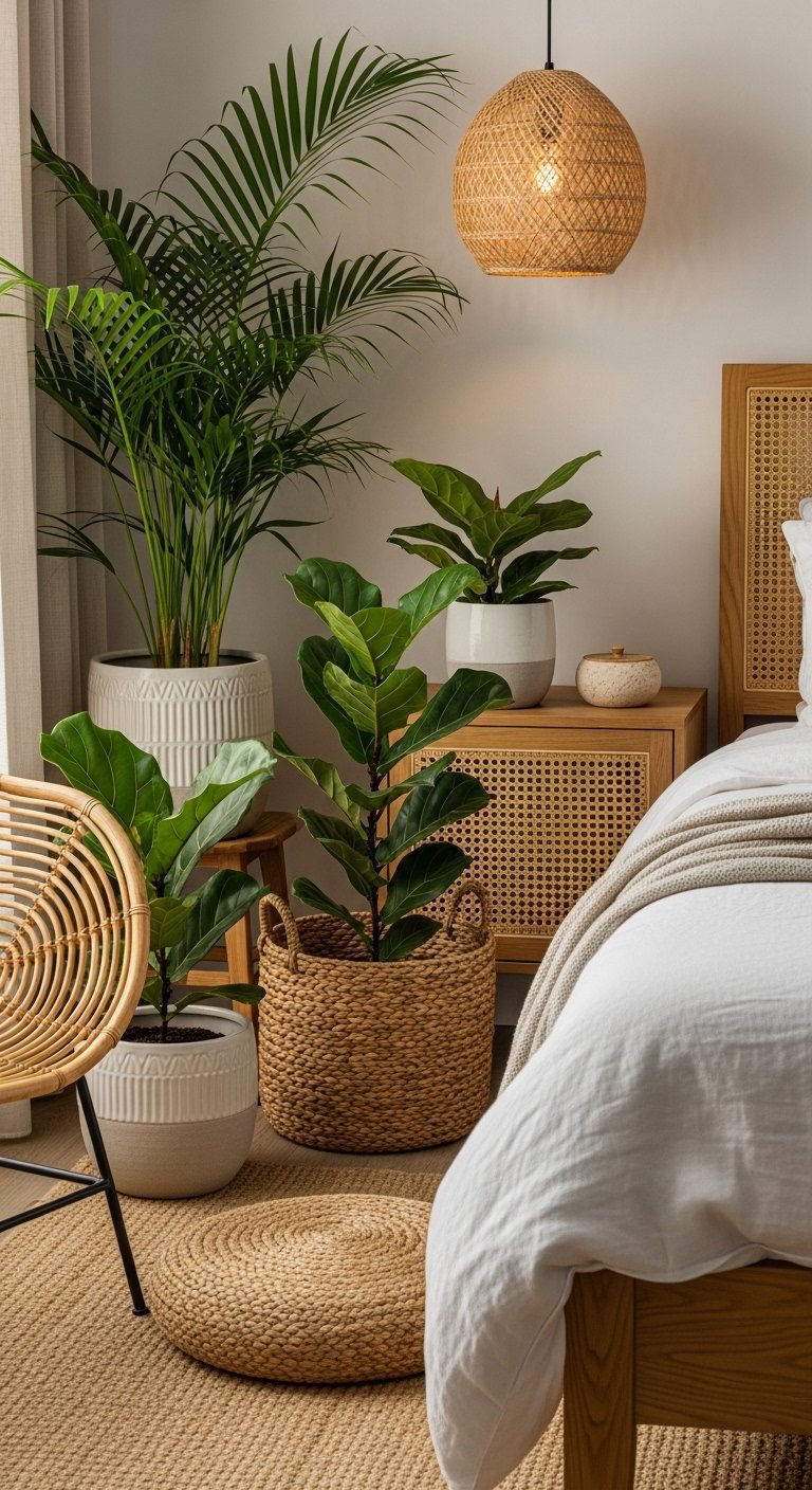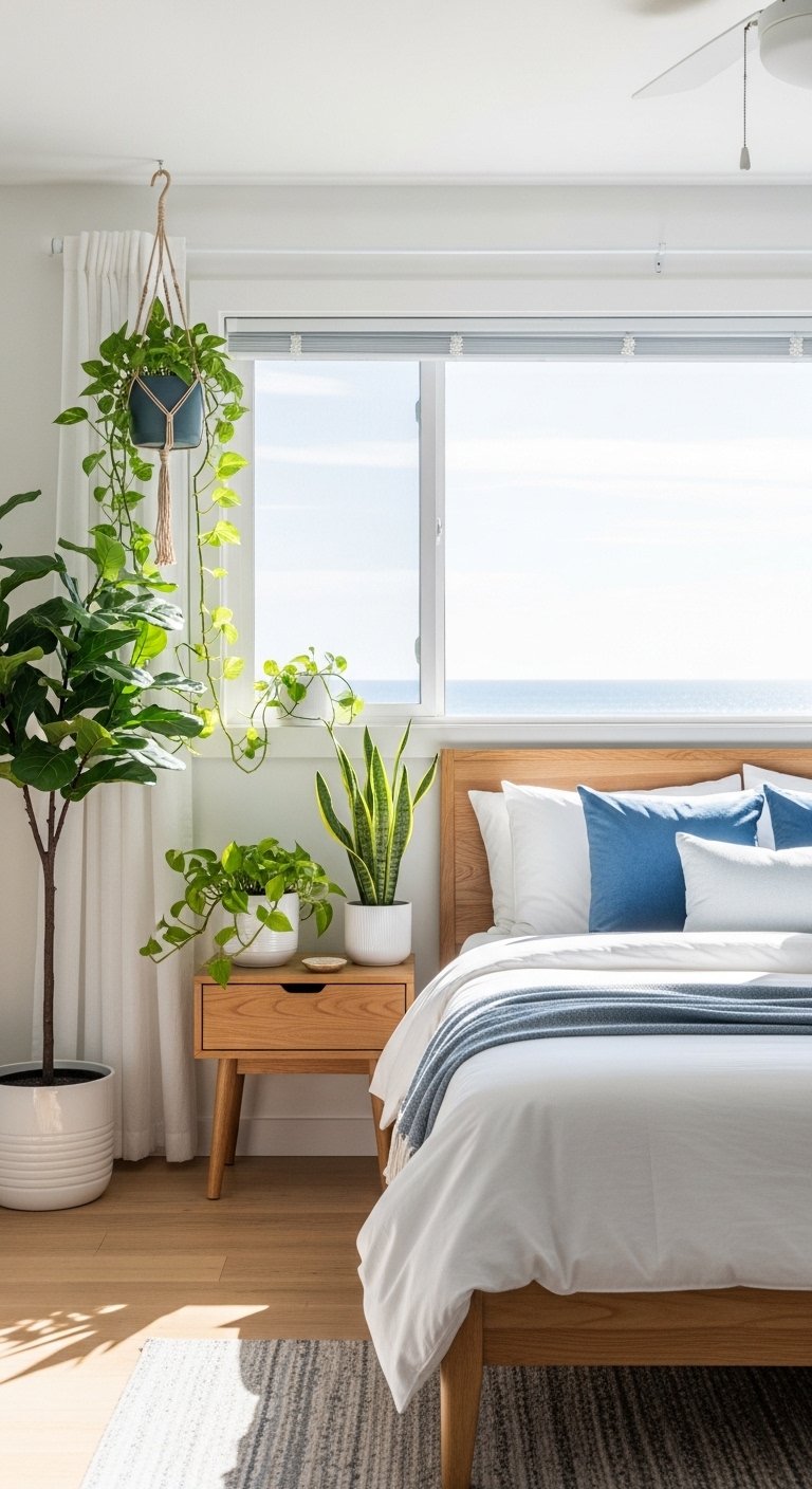 Bring life and freshness into your coastal bedroom with low-maintenance indoor plants like fiddle leaf figs, snake plants, or small palms. Their rich green tones contrast beautifully with soft coastal blues, whites, and neutrals, adding vibrancy and energy without overpowering the room. Use woven baskets or simple ceramic pots in natural hues to complement the coastal theme. Position plants near windows to maximize sunlight exposure, allowing leaves to catch and reflect natural light. Plants not only enhance visual appeal but also improve air quality, making your space feel healthier and more inviting. Incorporating greenery introduces organic texture and movement, giving your bedroom a lively yet serene coastal ambiance, perfect for Pinterest inspiration and daily enjoyment.