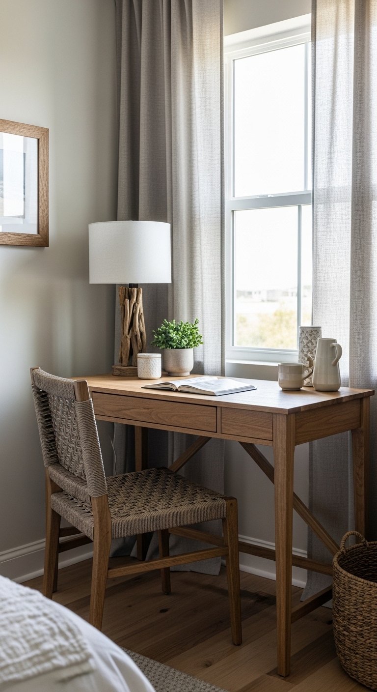 Transform a corner into a light, airy coastal-inspired desk nook using simple wood furniture, soft blues, and white accents. Opt for a small wooden or rattan desk paired with a wicker chair or cushioned stool. Add subtle coastal décor like a shell paperweight, driftwood lamp, or a small potted plant for natural vibrancy. Keep surfaces minimal to preserve the airy feel, while floating shelves above the desk can display delicate nautical prints or small baskets. Natural light from nearby windows enhances the light, breezy aesthetic, making the space feel open and relaxing. This practical addition allows you to blend function and style seamlessly, creating a Pinterest-ready coastal nook ideal for reading, writing, or working while remaining perfectly aligned with the bedroom’s light, serene ambiance.