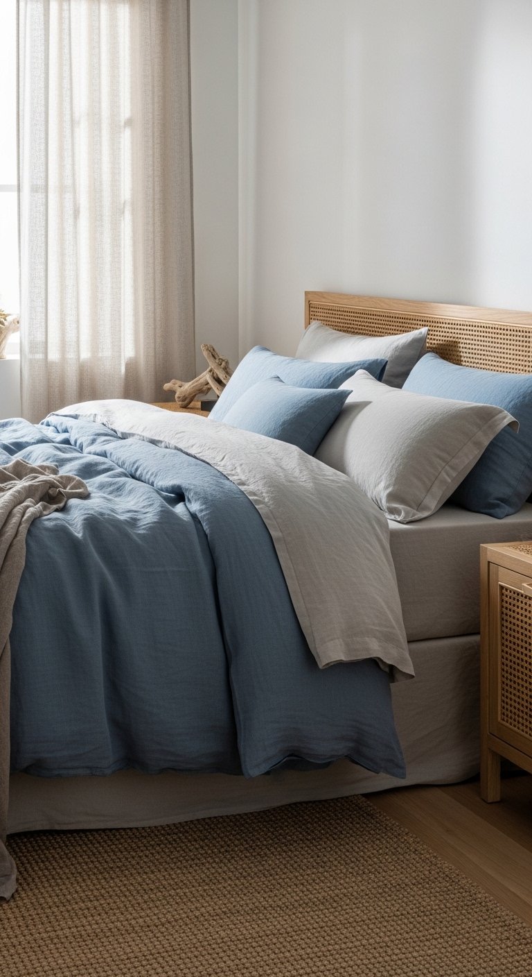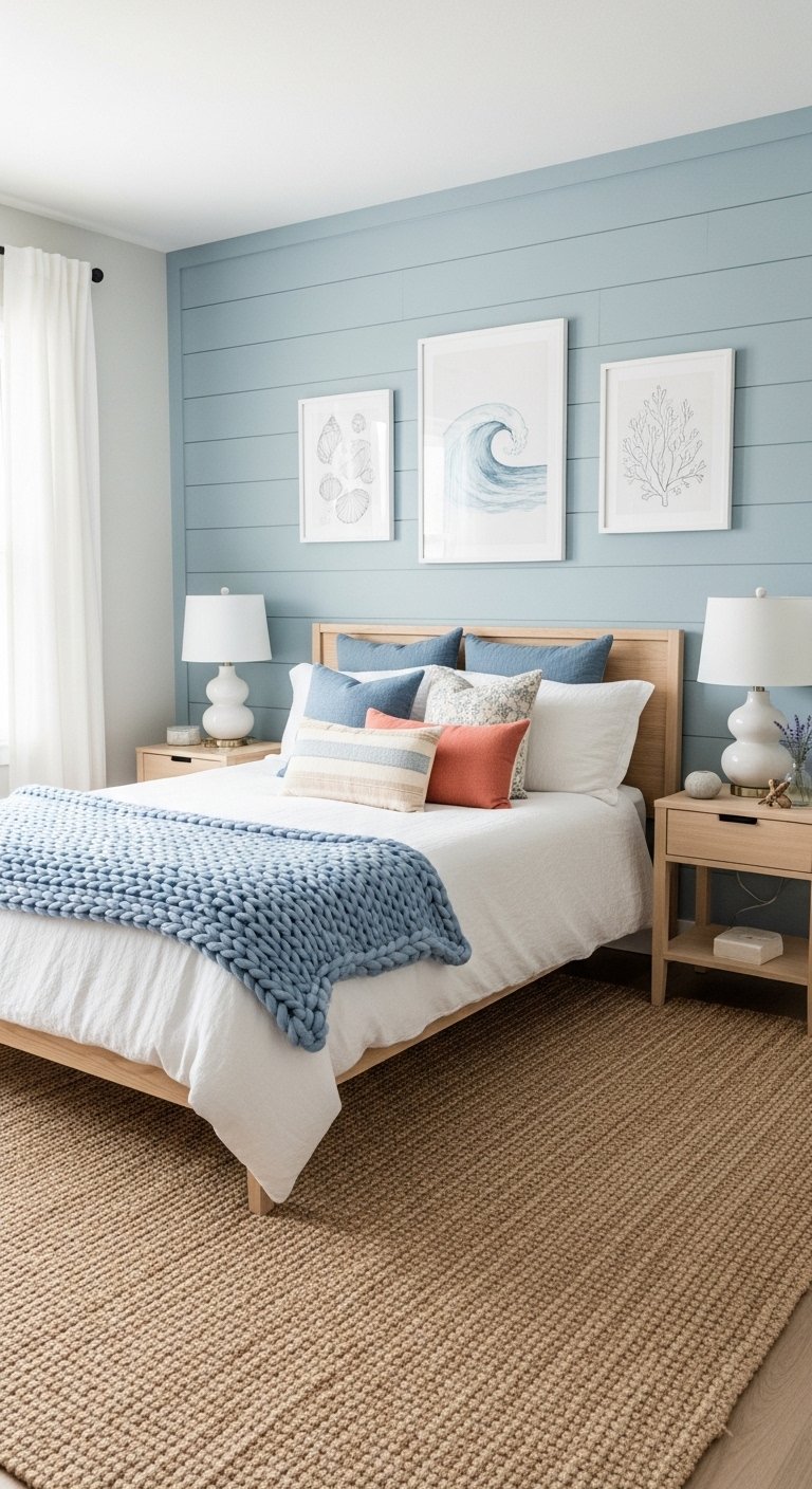 A coastal bedroom thrives on layers of blues and aquas, mimicking the natural gradient of the sea. Start with a crisp white or light sand-colored base sheet, then layer quilts, throws, and pillows in shades ranging from soft sky blue to deep ocean teal. Mixing textures like linen, cotton, and knitted fabrics adds depth while maintaining a breezy, relaxed vibe. A simple headboard in white, rattan, or pale wood complements the blue tones without making the room feel heavy. Scatter a few coastal-inspired pillows, such as subtle striped or embroidered designs, to enhance visual interest. The layering technique is not only aesthetically appealing but also practical for comfort and temperature control. This approach creates a bedroom that feels fresh and inviting, encouraging relaxation and perfectly suited for both everyday living and Instagram-worthy Pinterest boards, as it evokes a serene, ocean-inspired retreat that’s easy to implement.