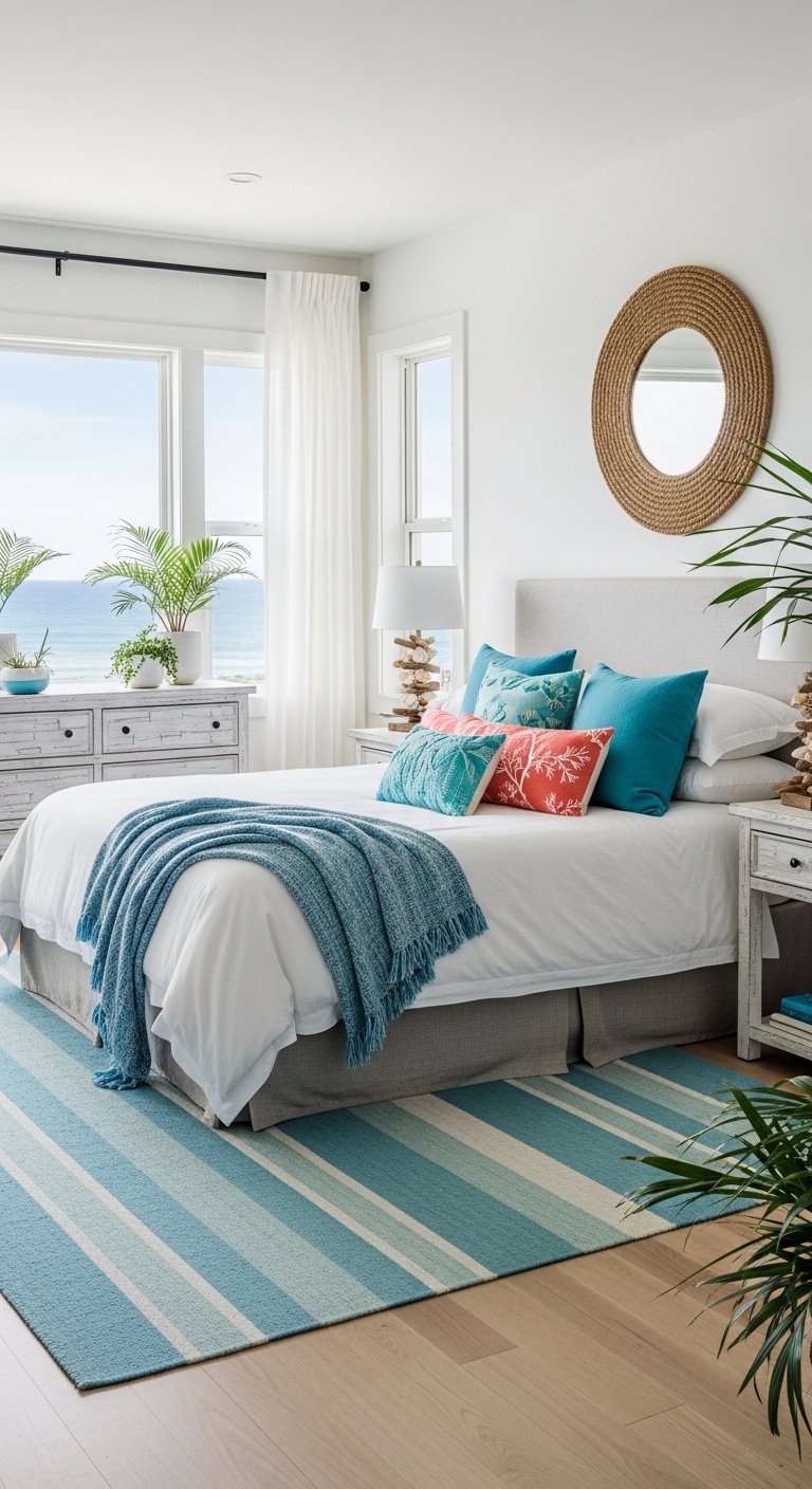 Adding natural fiber rugs like jute, seagrass, or sisal instantly elevates the coastal vibe while anchoring the room with subtle texture. These earthy tones complement soft coastal colors, creating a warm, grounded feel underfoot without overwhelming the space. Place a large rug beneath your bed to define the area and provide a soft, tactile layer that contrasts with sleek wood or tile floors. A smaller woven rug near a reading nook or window seat can add cozy accents while maintaining lightness. Pair these rugs with neutral-toned furniture and bedding to preserve the airy, open feel of a coastal room. Additionally, natural fiber rugs are practical and durable, ideal for high-traffic areas, and their organic patterns echo seaside textures like sand and driftwood. This combination results in a Pinterest-worthy coastal bedroom that feels effortless, harmonious, and deeply inviting.