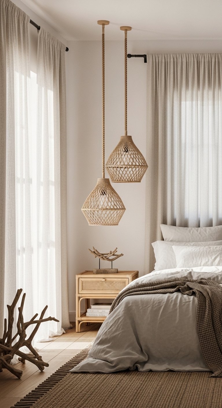 Replace bulky bedside lamps with hanging pendant lights crafted from natural materials like rattan, wicker, or rope. These lights save surface space while becoming visually striking focal points. The natural fibers diffuse light softly, producing a warm, inviting glow perfect for evening relaxation. Choose bulbs with a warm hue to mimic sunlight, enhancing the coastal ambiance. Pendant lights above the bed or nightstands create a layered lighting effect that balances practical illumination with decorative charm. Rope or driftwood details can be incorporated into the design for a subtle nautical touch. This approach not only frees bedside space but also introduces vertical interest and texture, giving your bedroom a curated, professional look that is both functional and Pinterest-worthy.