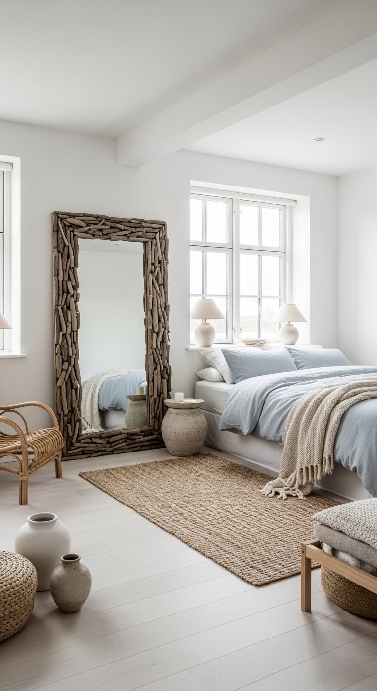 Mirrors framed in driftwood, rattan, or rope instantly amplify light and create a sense of spaciousness, perfect for a coastal bedroom. A large standing mirror or a cluster of smaller wall mirrors can reflect sunlight, enhancing the room’s airy feel. Choose frames in natural textures or muted tones to maintain harmony with the coastal palette. Strategically placing a mirror across from a window maximizes brightness and draws the eye outward, making the space feel larger and more open. Decorative mirrors also serve as both functional and aesthetic pieces, helping you style your bedroom effortlessly. This technique creates a Pinterest-worthy focal point while reinforcing the light, breezy coastal vibe without overwhelming the room.