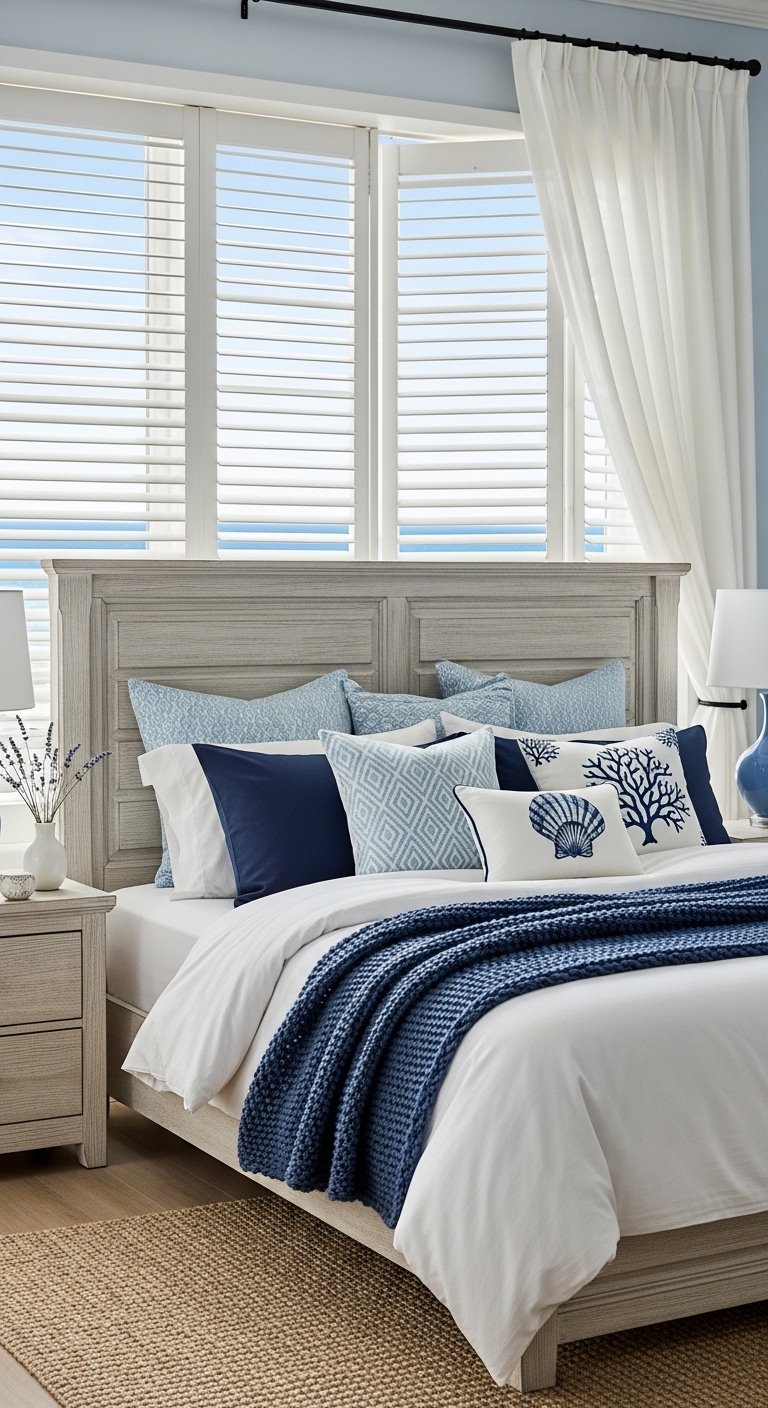Achieve depth and visual interest in your coastal bedroom by layering throws and pillows with varied textures and patterns. Combine linen, cotton, and knitted fabrics in soft blues, whites, and sandy neutrals to create a cozy yet airy vibe. Add a few accent pillows with subtle stripes, embroidered seashells, or wave patterns for a nautical feel without overwhelming the space. Layering creates dimension and comfort, transforming a simple bed into a luxurious, inviting centerpiece. The mix of textures encourages tactile interaction, making the space feel more personal and relaxed. Strategically placed throws at the foot of the bed or over a chair complete the look, ensuring your bedroom feels like a serene seaside retreat, perfectly Pinterest-ready, and ideal for both everyday comfort and visual inspiration.