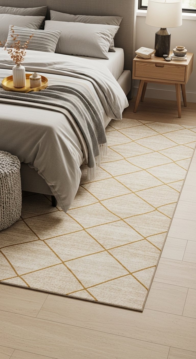 Anchor your bedroom with a beige rug featuring gold geometric patterns. It introduces reflective shine subtly, grounding the space while adding visual interest. Pair it with neutral bedding, soft upholstered furniture, and small gold accessories, creating a cohesive metallic theme. Rugs offer both comfort underfoot and a decorative foundation, setting the tone for the rest of the décor. A gold-accented rug complements layered textiles like cushions, throws, and curtains, making the room feel curated and balanced. This approach proves that luxury can start from the floor up, resulting in a warm, Pinterest-ready space that feels elegant yet approachable.