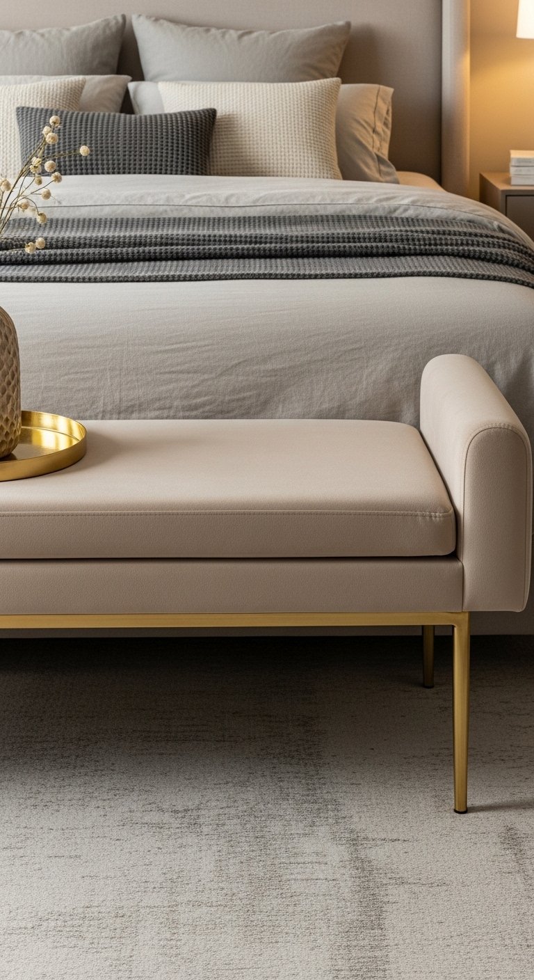 Introduce a seating corner with beige leather chairs or benches accented with gold legs or armrests. Leather adds sophistication, while gold touches inject a subtle metallic elegance. Place the seating near a window or beside a dresser for a functional yet decorative feature. Add a small gold side table or lamp to integrate the metallic theme seamlessly. Cushions and throws in soft beige and ivory tie the seating into the room’s palette, creating a comfortable, luxurious nook. This combination of texture, neutral tones, and metallic sparkle results in a high-end, Pinterest-worthy aesthetic that feels approachable, practical, and effortlessly stylish.