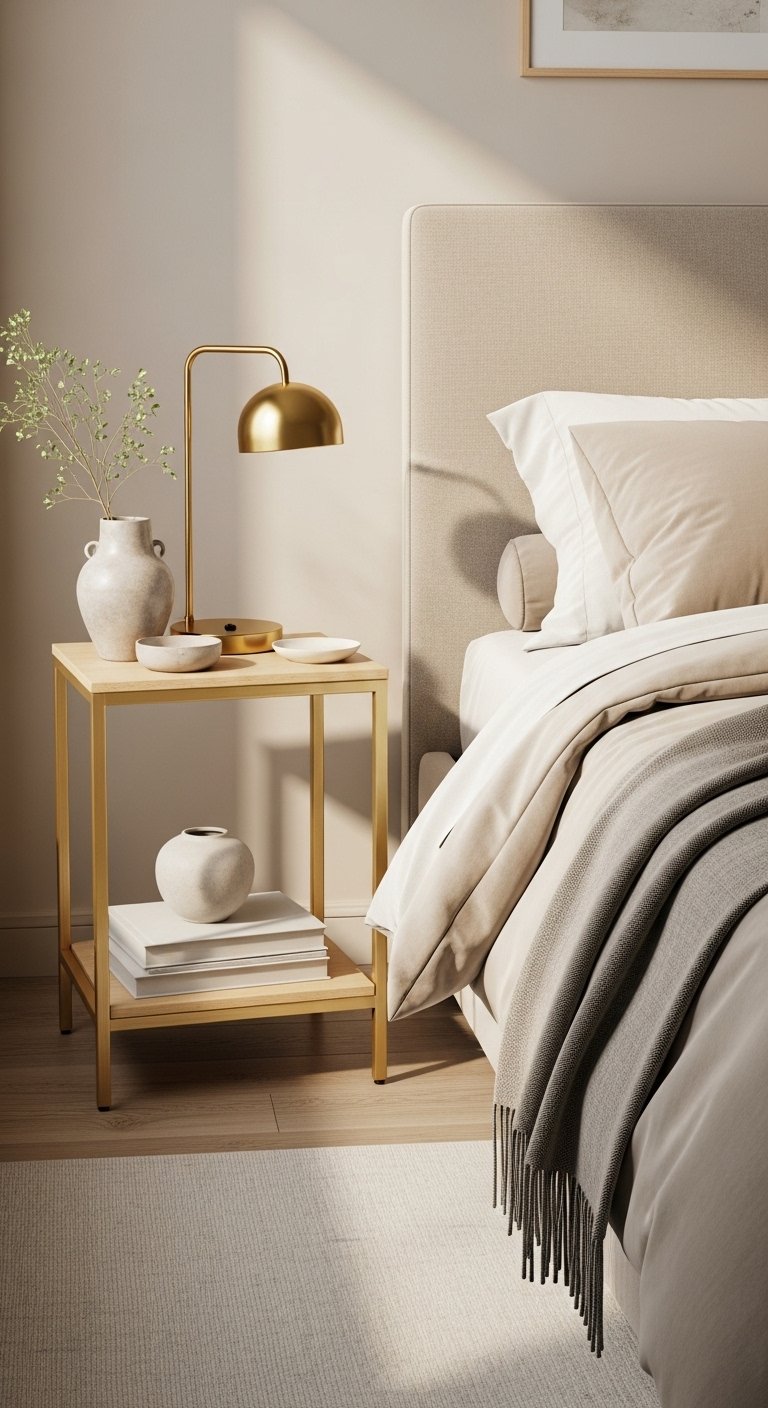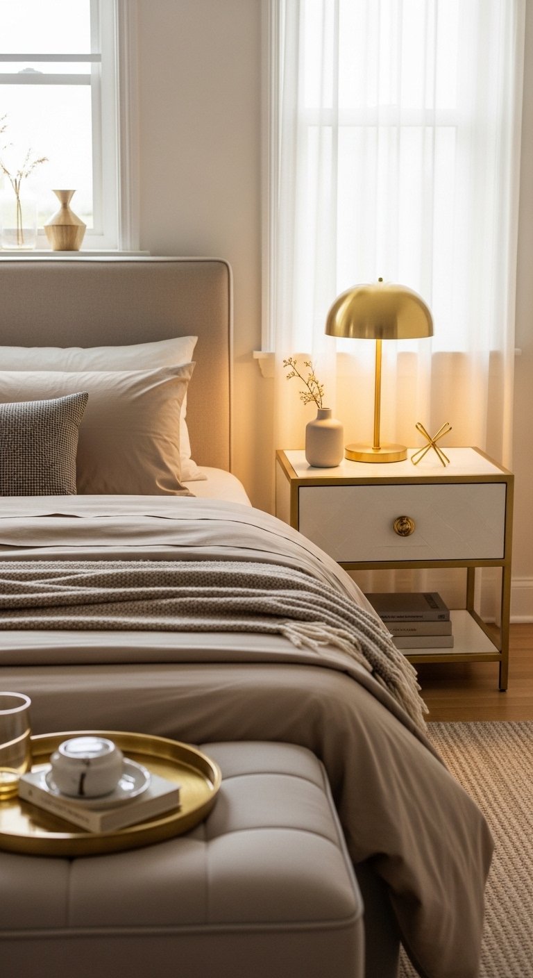 Swap traditional nightstands for gold-toned pieces with reflective surfaces or brushed finishes. These tables serve as both functional and decorative elements, instantly adding glamour. Keep walls and bedding neutral in beige to avoid visual overload. Style the nightstands minimally with gold lamps, a small vase, or a decorative tray. Layer textures nearby, like a soft rug, woven throw, or linen pillows, to enhance warmth. By combining metallic highlights with calm beige surroundings, you create a bedroom that feels curated, high-end, and Pinterest-worthy. This balance ensures the metallic shine feels sophisticated, not overpowering, and makes every detail appear intentional.
