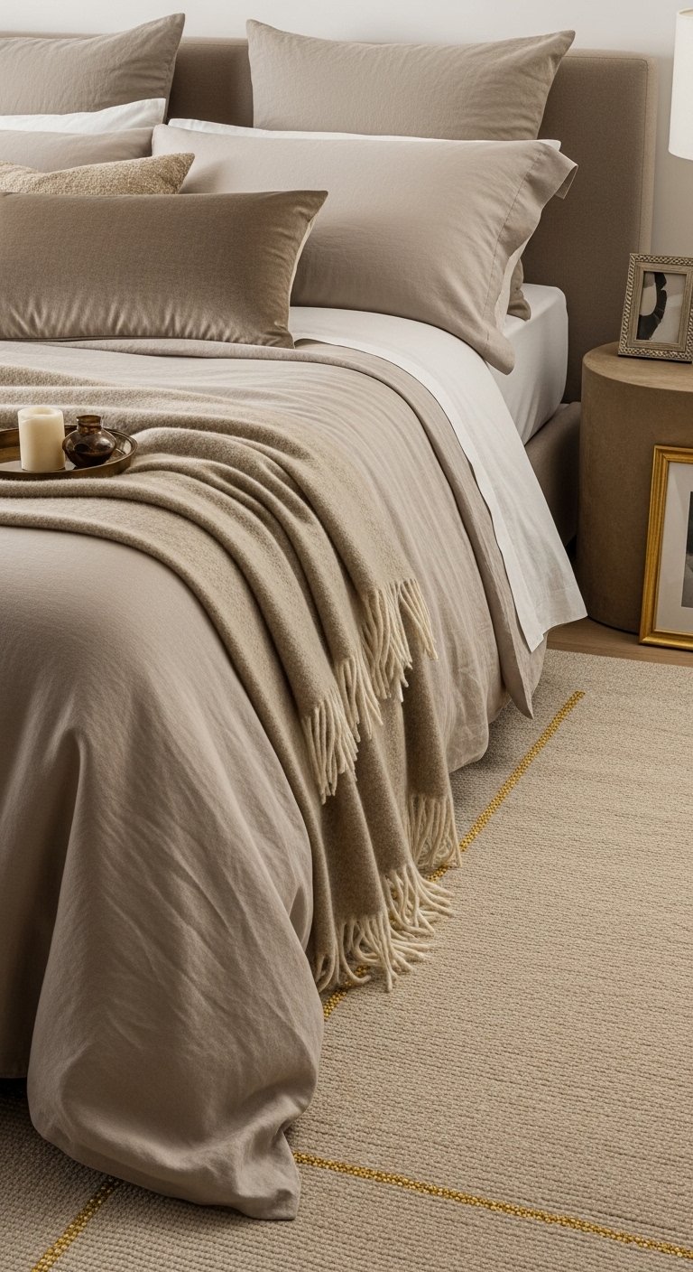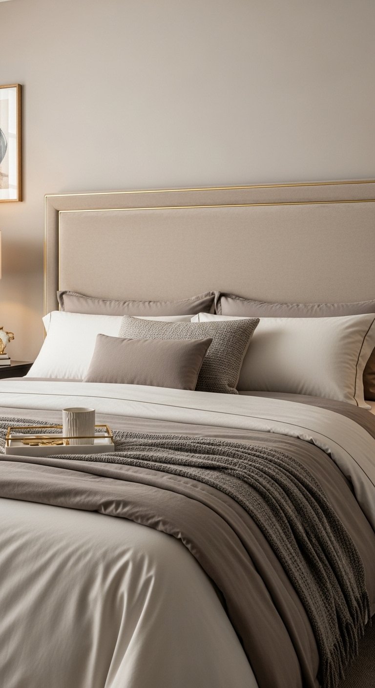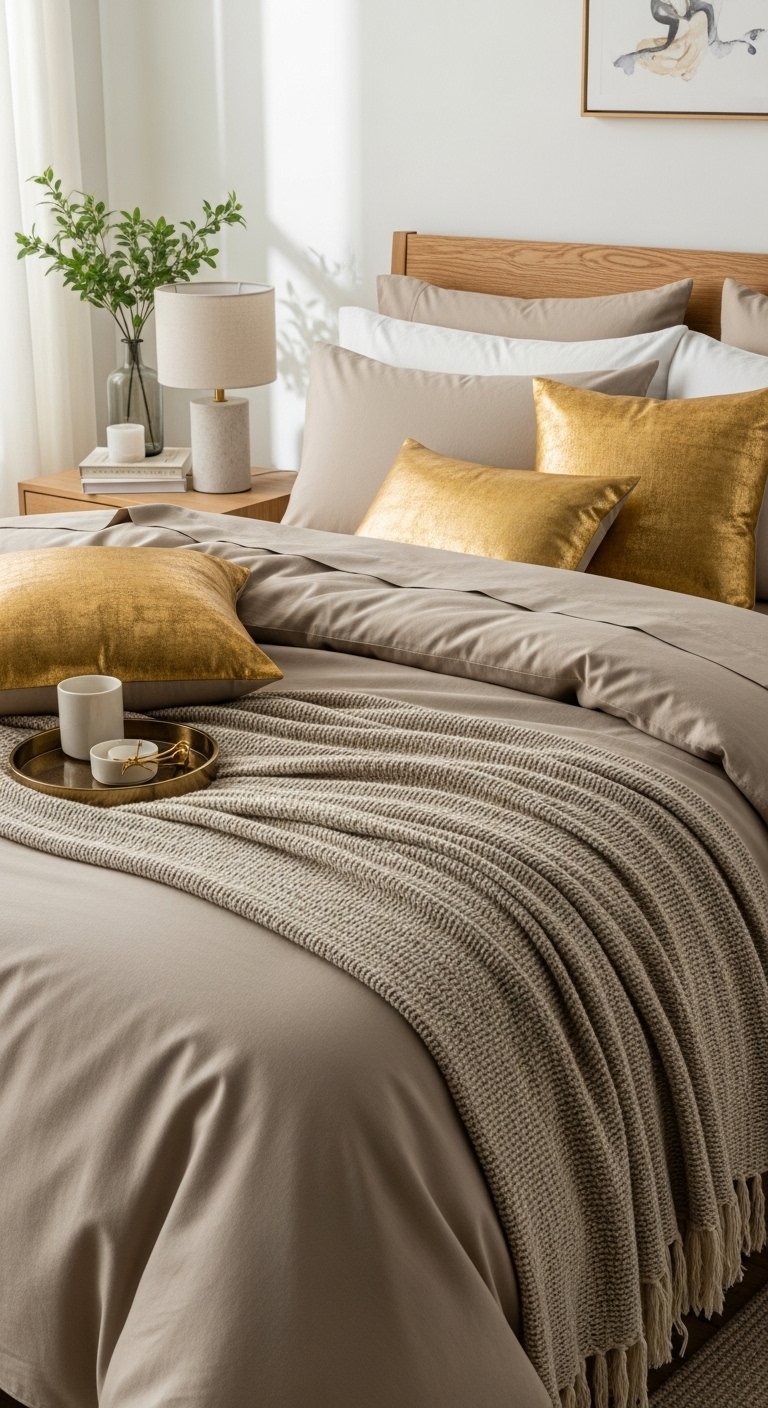 Luxury often comes from layering textures. Start with a base of soft beige linen sheets and add a plush wool throw or velvet cushions in slightly varied shades of beige. Introduce gold through small decorative accents—lamp bases, curtain rods, picture frames, or even a gilded jewelry tray. A neutral area rug with faint gold threads can tie the look together, catching light subtly throughout the day. Combining different textures—smooth linen, soft velvet, cozy wool—creates depth while keeping the palette serene. The key is balance: gold should enhance, not dominate, allowing the beige layers to feel rich and calming. Arrange cushions and throws in a slightly asymmetrical style for a lived-in, elegant vibe. This approach demonstrates that luxurious bedrooms don’t need heavy ornamentation; they thrive on thoughtful materials, light-reflecting accents, and tactile comfort, making it ideal for anyone seeking a Pinterest-ready, high-end look that is both inviting and stylish.
