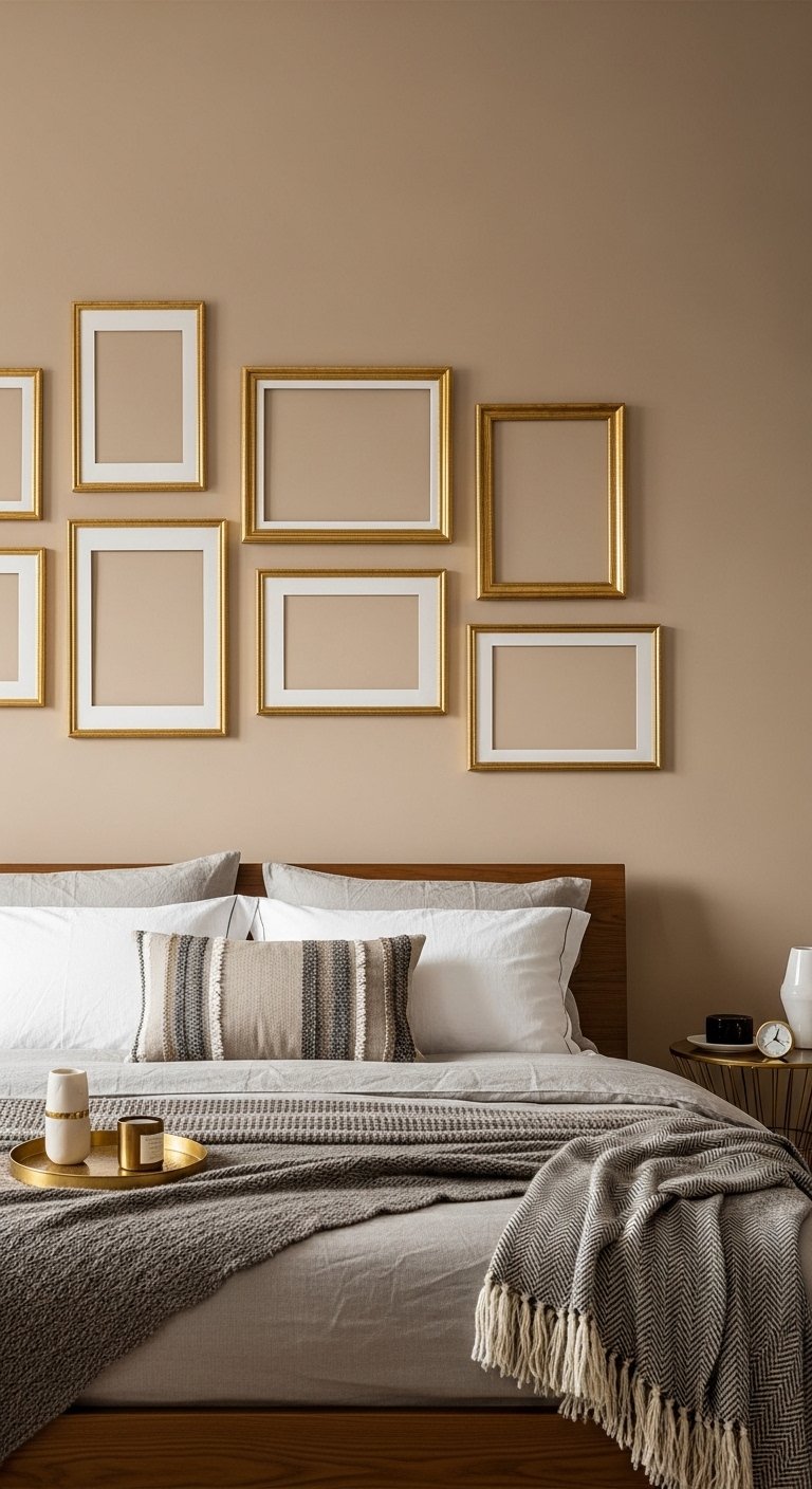 Elevate your bedroom walls with art pieces framed in gold, creating a gallery feel against warm beige walls. Choose artwork in soft, muted tones or abstract designs that complement the beige palette, allowing the gold frames to shine. Position pieces at eye level or in a balanced cluster above the bed or dresser. For a cozy touch, pair with plush bedding, beige cushions, and a textured throw, maintaining harmony between artwork and furniture. Incorporate gold accessories like candle holders or a mirror to echo the frames. This setup delivers a sophisticated, Pinterest-worthy look, proving that wall décor can instantly add luxury when color, frame material, and placement are thoughtfully combined.