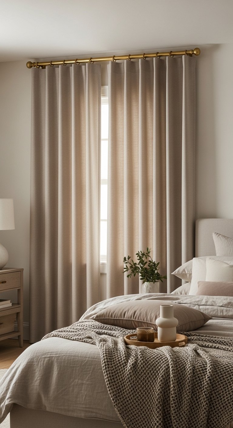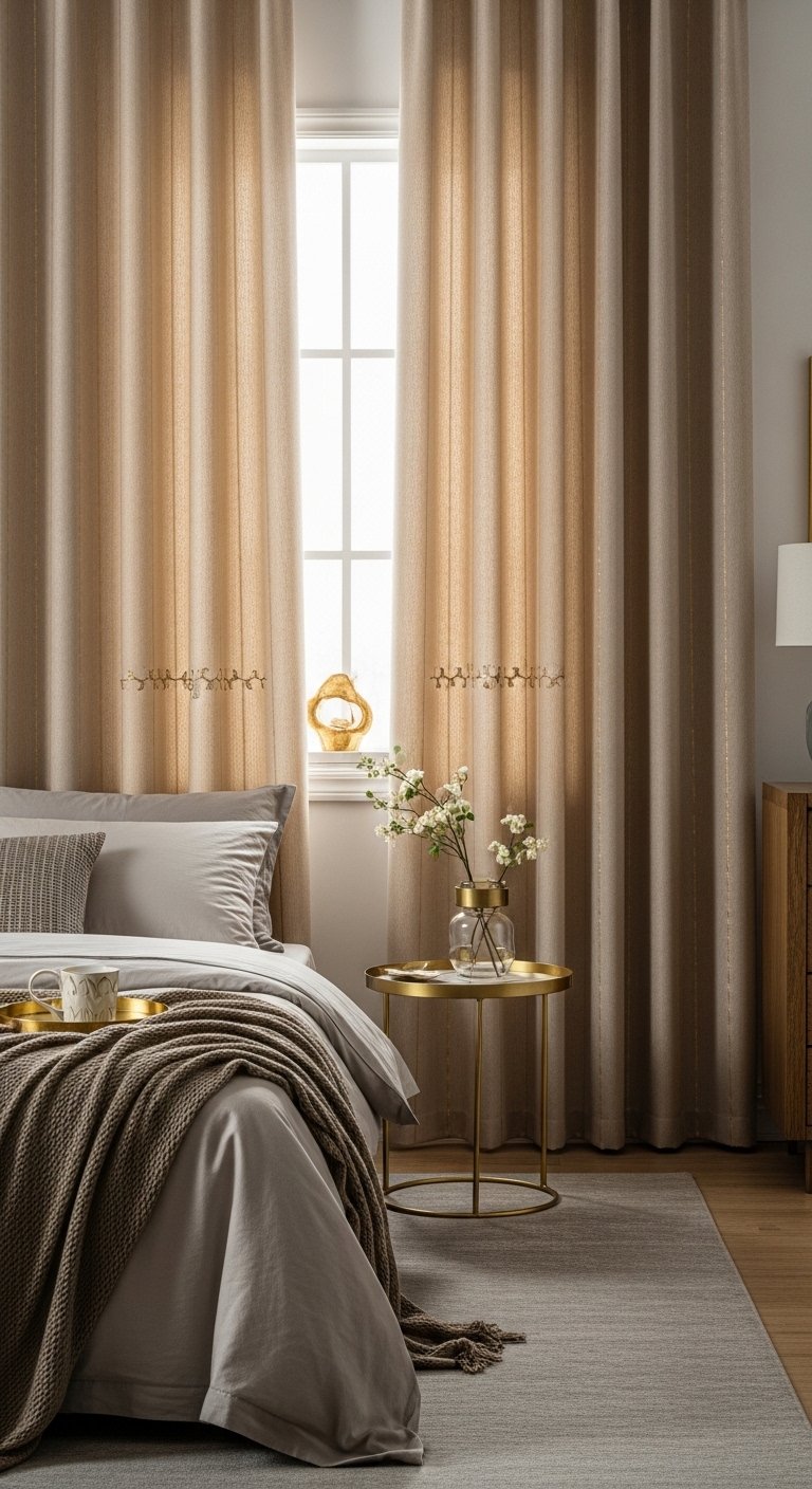 Textiles are an effortless way to introduce luxury. Choose beige curtains embroidered with fine gold threads or metallic trim, catching sunlight softly and adding shimmer without overwhelming the space. Pair with neutral walls, plush bedding, and subtle gold décor, such as a lamp base or decorative tray. Layer textures with throws, cushions, and rugs to enhance comfort and visual richness. This approach creates a serene, inviting atmosphere while demonstrating how small metallic accents woven into fabric can elevate a room’s aesthetic. The result is a cohesive, elegant, and Pinterest-ready bedroom that feels both luxurious and lived-in.