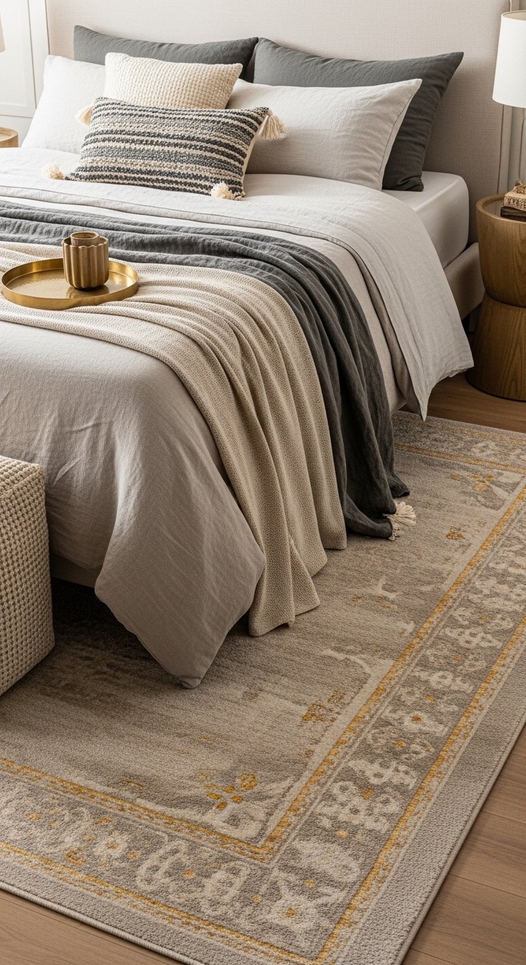 For a bedroom that feels plush and curated, layer multiple beige rugs with subtle gold accents. Start with a neutral base rug in soft wool or jute, then overlay a smaller rug featuring metallic gold threads or geometric patterns. This layering adds depth and texture, making the room feel more luxurious without being overwhelming. Pair with beige bedding and minimal gold décor like lamps, trays, or frames to maintain balance. Textured cushions, throws, and a few natural elements such as dried pampas or a wooden bench provide visual contrast. This combination creates a tactile, Pinterest-ready bedroom where luxury is derived from texture, layered design, and careful metallic integration, showing that opulence can be understated and inviting rather than flashy.