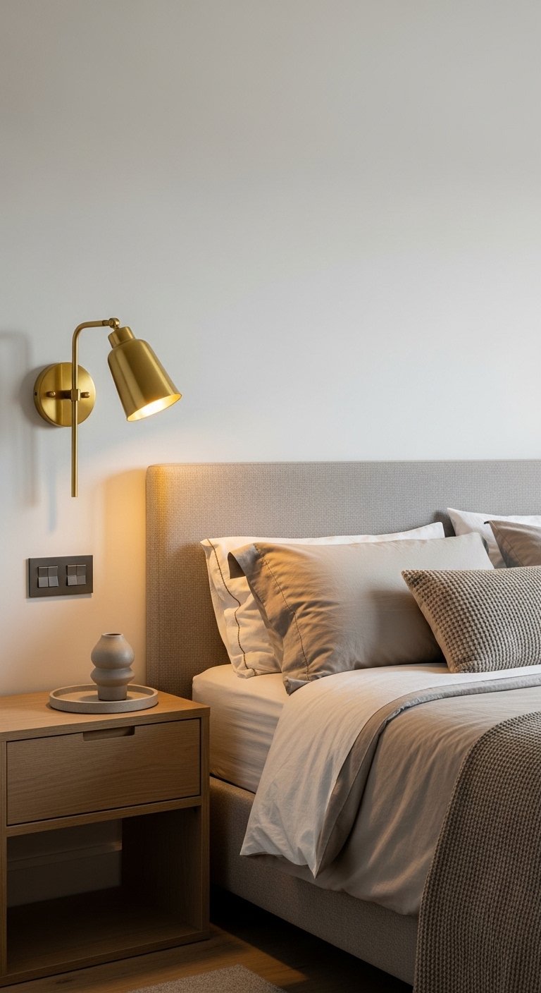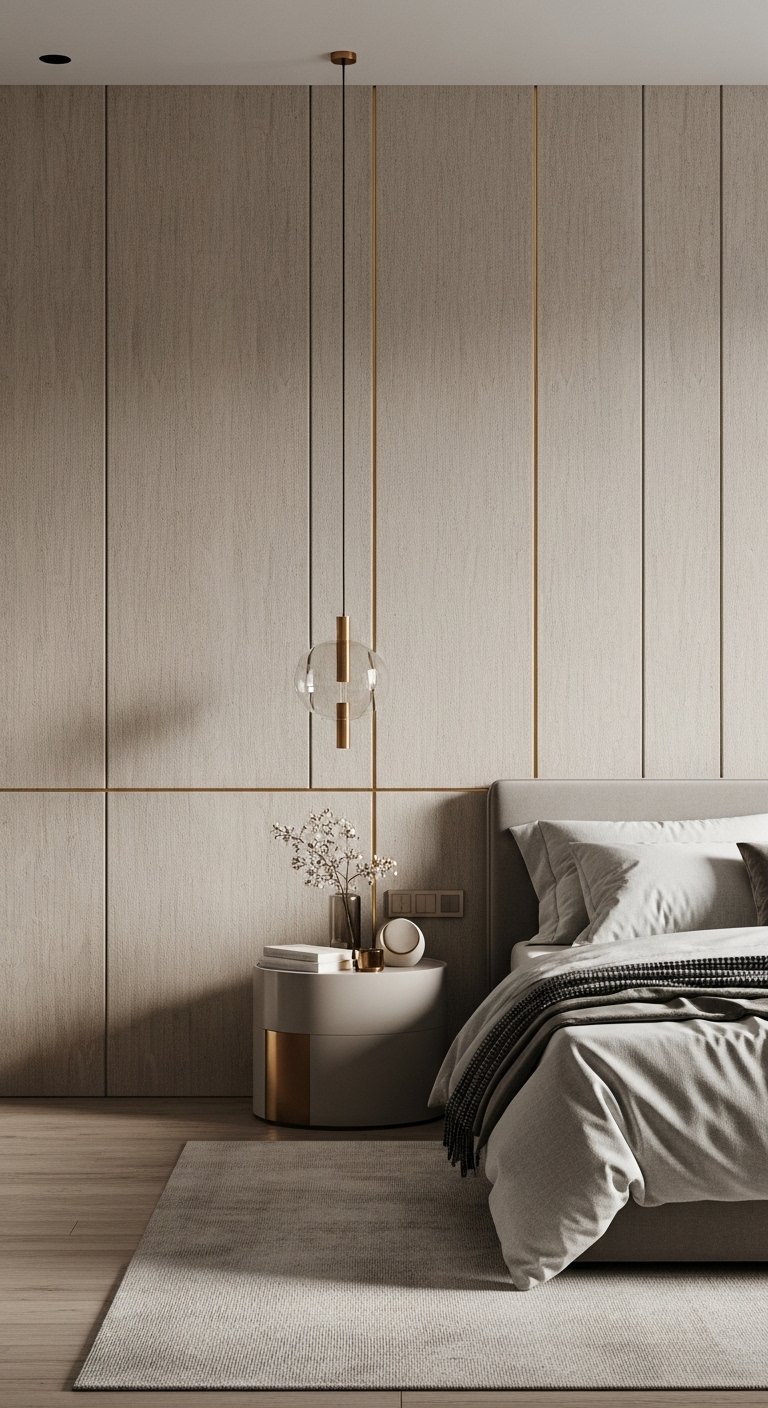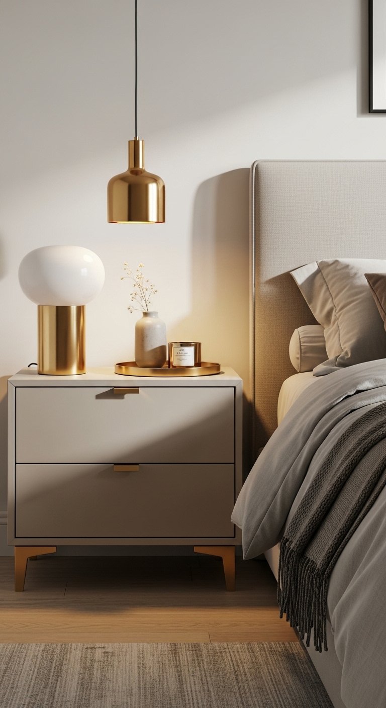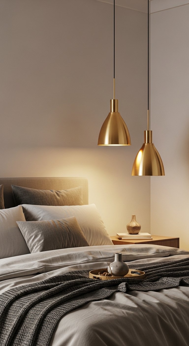 Lighting can act as décor, and gold pendant lights above a beige bed add instant sophistication. Suspend them at varying heights to create visual interest and highlight the neutral bedding below. Keep linens, rugs, and curtains in soft beige or cream tones to allow the pendants to shine. Small reflective accessories like a gold tray or vase complete the metallic theme without cluttering the space. Pendant lighting adds warmth, creates shadows for depth, and draws attention upward, giving the bedroom a Pinterest-ready, high-end feel. This approach demonstrates that luxury can be achieved through strategic lighting placement, balancing function with elegance.