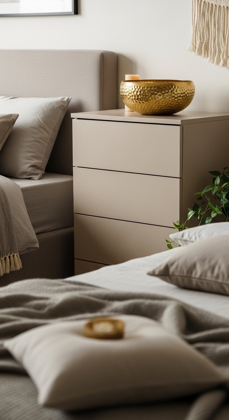 Replace standard nightstands with gold-accented or metallic-finished bedside tables to bring subtle opulence to the room. Pair them with neutral beige bedding to balance shine with softness. Functional styling matters: place a gold lamp, a vase, or a stack of neutral-toned books to create a curated look. The reflective surfaces of the tables catch ambient light, adding warmth and depth, while the beige backdrop maintains serenity. This setup creates a layered, Pinterest-ready design, demonstrating how small metallic touches can elevate a room’s aesthetic without overwhelming it. Soft textures like wool rugs or linen throws keep the space inviting, proving that luxury can be practical, stylish, and comfortable simultaneously.
