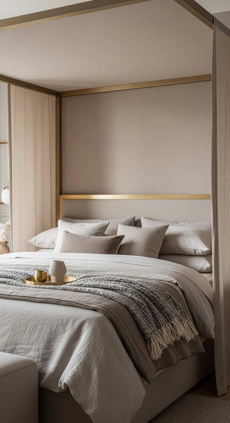 A canopy bed in soft beige instantly creates a luxurious focal point. To elevate it, choose delicate gold trims along the canopy frame or drape sheer golden fabric from the top for a subtle shimmer. Layer bedding in neutral shades—cream, ivory, or soft taupe—and add plush cushions and throws with metallic accents to enhance the layered, tactile effect. Pair with minimal furniture in beige or wood tones, and add gold-accented bedside lamps to reflect light around the room. The combination of soft neutrals with strategic metallic touches creates a sophisticated yet cozy retreat. Light-filtering curtains allow natural sunlight to enhance the shimmer, making the room feel airy, warm, and Pinterest-ready. This idea demonstrates that luxury can be achieved through thoughtful layering, texture, and understated metallic details, giving the bedroom a curated and serene elegance.