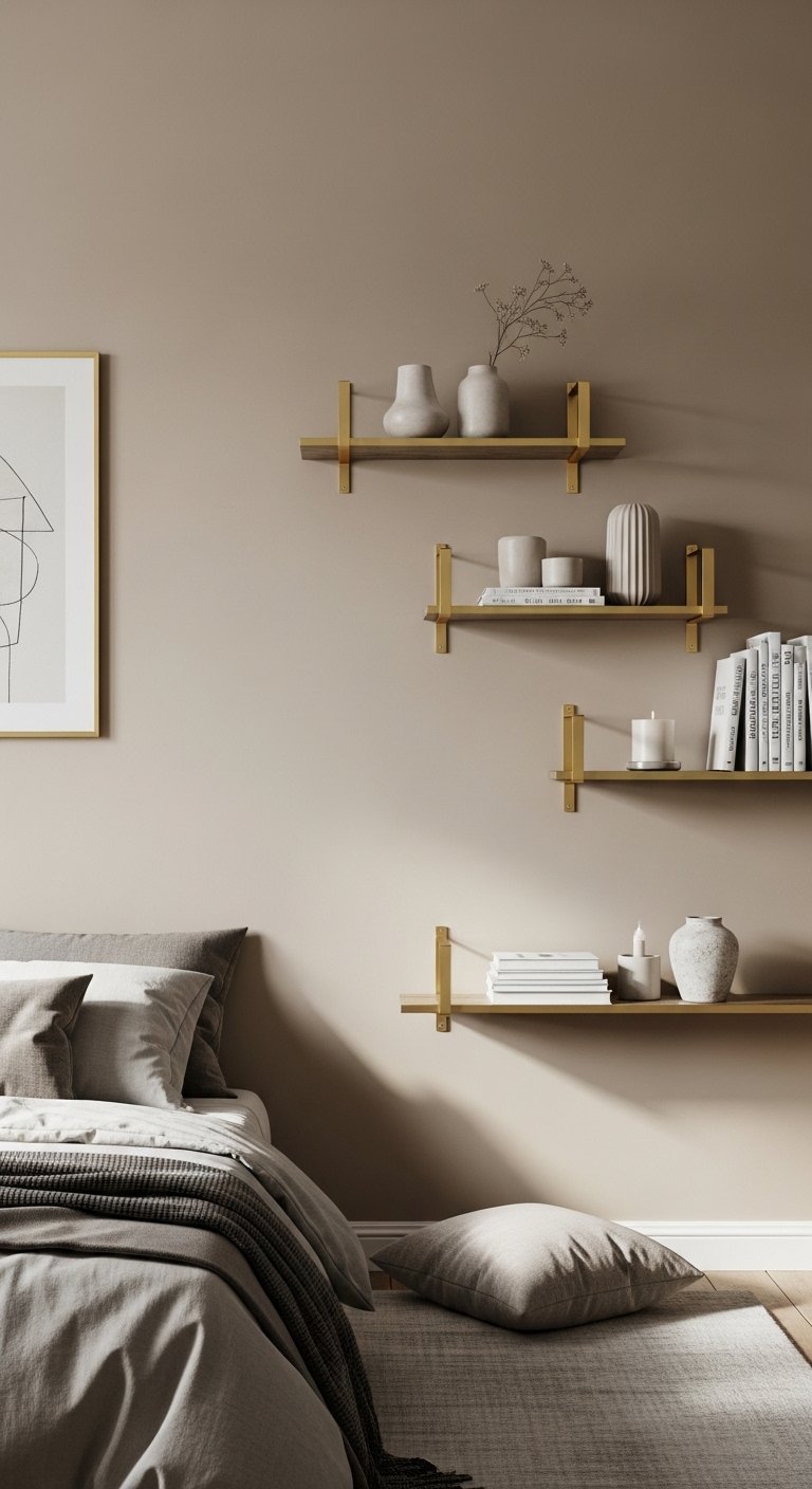 Incorporate floating gold-accent shelves on beige walls to create both function and visual intrigue. Use them to display carefully curated décor—small plants, gold-trimmed frames, or neutral-toned ceramics—ensuring the metallic accents complement the beige backdrop. Pair with soft beige bedding, textured throws, and layered rugs to maintain warmth and balance. Strategically place soft lighting, like sconces or LED strips, to highlight the gold reflections subtly. This design merges storage and style seamlessly, proving that luxury doesn’t require clutter—thoughtful accents elevate a serene foundation into an elegant, Pinterest-worthy space. By combining reflective metallics with soft neutrals, you create a bedroom that feels sophisticated, inviting, and visually dynamic, ready to inspire anyone seeking a high-end yet approachable design.