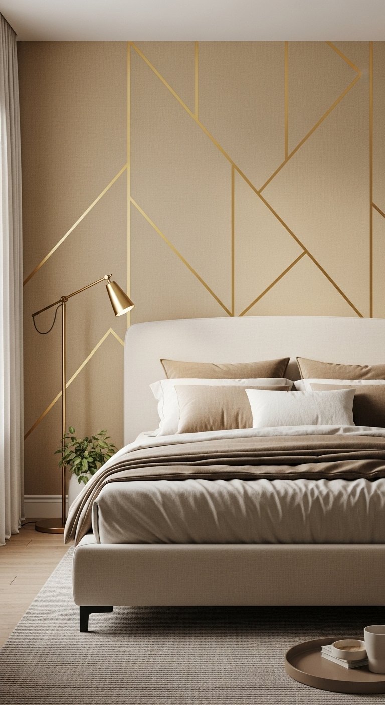 A beige wall offers the perfect calm base, but adding a gold geometric accent instantly transforms it into a statement feature. Think subtle triangles, hexagons, or thin linear patterns painted in warm gold tones. These shapes catch sunlight during the day and reflect soft lamp light at night, creating a dynamic, luxurious feel. Pair this wall with cream or ivory bedding, and choose a low-profile upholstered bed to keep the room balanced. Add a beige area rug with soft texture and a couple of velvet throw pillows in neutral tones to complement the shimmering gold. To enhance the atmosphere, position a warm-toned floor lamp or pendant light near the wall, highlighting the geometric design without overpowering the room. The contrast between matte beige and metallic gold makes the space feel modern yet cozy, perfect for a Pinterest-worthy bedroom that blends calm sophistication with subtle drama.