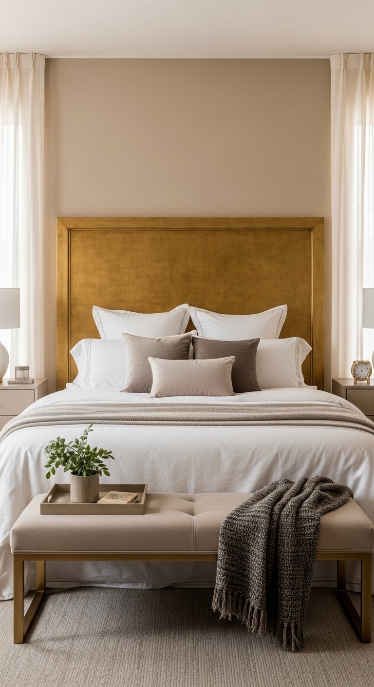 A bold gold headboard can instantly elevate a beige bedroom into a luxurious retreat. Choose between a sleek, modern metallic frame or a detailed, ornate design depending on your style preference. Keep bedding neutral, like soft ivory or sand-colored linens, so the headboard remains the centerpiece. Flank the bed with matching gold-accented bedside lamps or wall sconces, creating visual symmetry and a cohesive metallic theme. A beige bench or ottoman at the foot of the bed softens the metallic edge while adding a practical seating option. Incorporating soft textures, such as a plush throw or velvet cushions, enhances comfort while maintaining elegance. This layout makes the room feel curated, layered, and perfectly balanced for Pinterest photography, as it combines a striking focal point with approachable neutral surroundings, showcasing that gold can be bold yet refined when paired thoughtfully with beige.