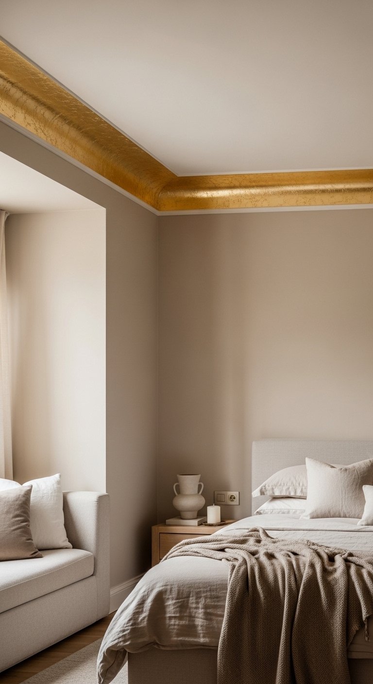 Add unexpected luxury by focusing on the ceiling. A subtle gold leaf design—perhaps along borders or as a geometric pattern—draws the eye upward, making the room feel taller and more glamorous. Keep the walls warm beige to provide a soft canvas that allows the ceiling detail to shine. Pair with low-profile beige furniture and soft linen bedding to maintain a cozy atmosphere. Accents like gold-trimmed mirrors, candle holders, or picture frames echo the ceiling detail without competing visually. Layer lighting strategically: a chandelier or warm pendant lights above the bed highlight the gold leaf, while bedside lamps soften shadows. This combination creates a sophisticated, Pinterest-ready bedroom that feels elevated yet intimate. The interplay between reflective gold and calming beige ensures the space is elegant and serene, proving that small, unexpected touches can make a significant design impact.