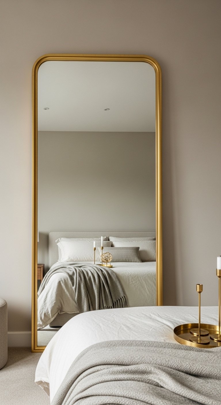 Mirrors can multiply light and make a bedroom feel more spacious, especially when framed in polished gold. Position one large mirror across from a window to reflect natural sunlight, instantly brightening the room. Complement it with soft beige walls and bedding to maintain a calm backdrop, allowing the gold frame to stand out as a sophisticated focal point. Add smaller metallic accessories, like a golden tray, a clock, or decorative candle holders, to create a cohesive metallic theme. For texture, layer in plush rugs or cushions in beige tones, softening the reflective surfaces. This setup is both functional and visually appealing: it enhances light, creates depth, and adds a luxurious yet approachable vibe. The combination of beige softness and gold highlights ensures your bedroom feels curated, elegant, and ready for Pinterest inspiration.