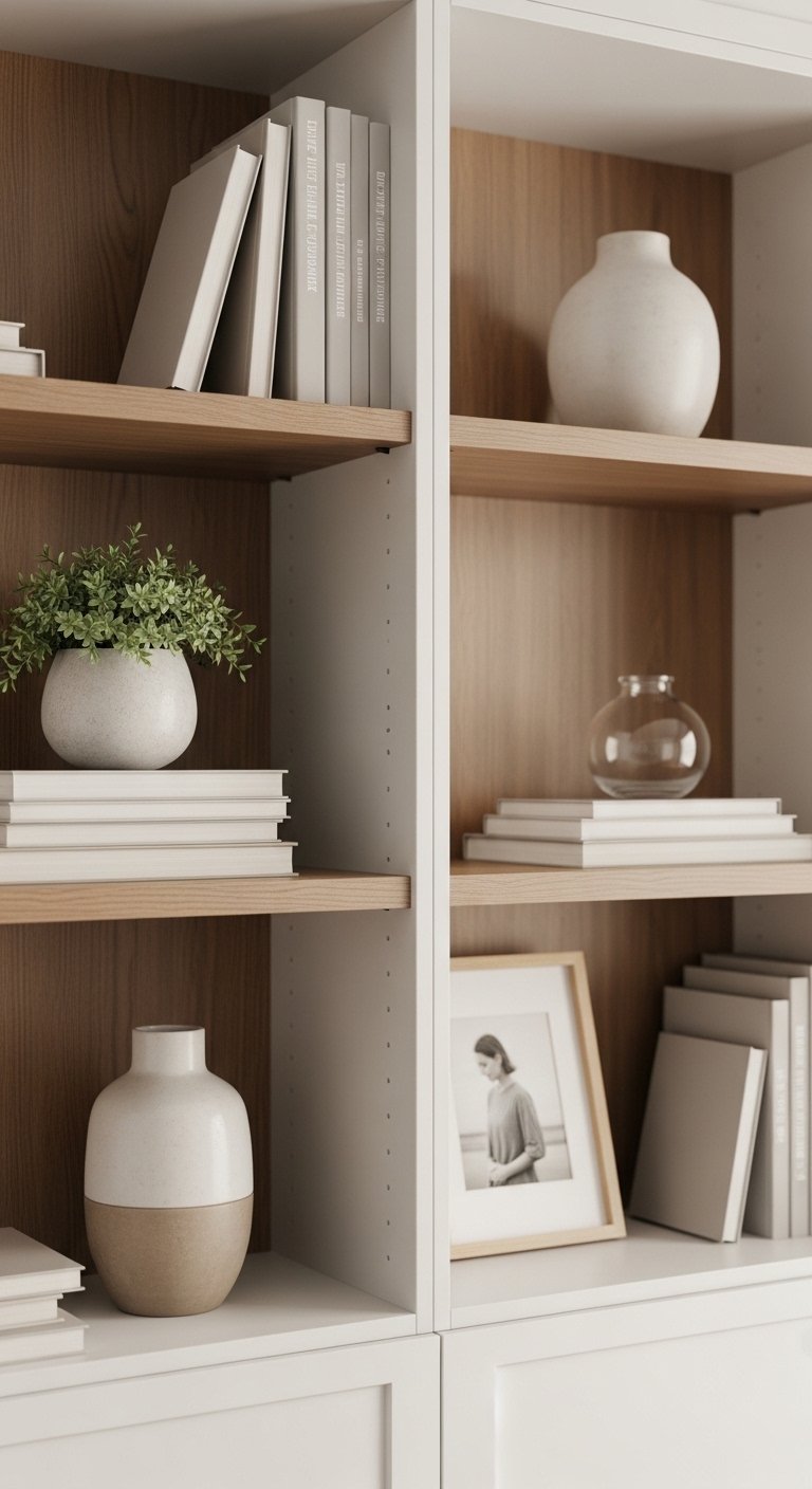 Open shelves can look messy if not styled well. Keep things simple and balanced. Use a mix of books, small plants, and decorative objects.Stick to a color palette like white, wood, and soft green for a clean look. Place taller items at the back and smaller ones in front. Leave some empty space to avoid clutter.You can also add a framed photo or a small vase for variation. This arrangement feels neat and stylish. It turns your shelves into a visual highlight without spending much.