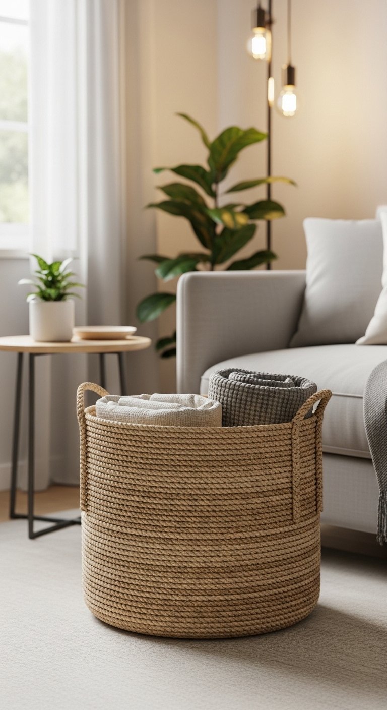 Baskets are both useful and stylish. Use them to store blankets, magazines, or small items. Choose natural materials like wicker or jute for a warm and earthy look.Place a large basket next to your sofa or under a console table. Smaller baskets can go on shelves or corners.This keeps your living room organized while adding texture. It also reduces clutter, which makes your space feel calm and clean. Simple storage solutions can make a big difference in how your room looks.
