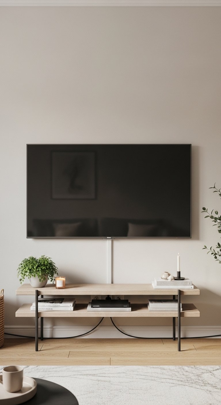 Your TV wall can look stylish with a few small changes. Add a slim console table or shelf under the TV. Keep it clean and minimal.Place a few decor items like a small plant, books, or a candle. Use neutral tones to avoid distraction. Hide cables using simple clips or covers for a neat look.You can also frame the TV with light decor pieces to make it blend into the room. This makes the area look intentional instead of plain.