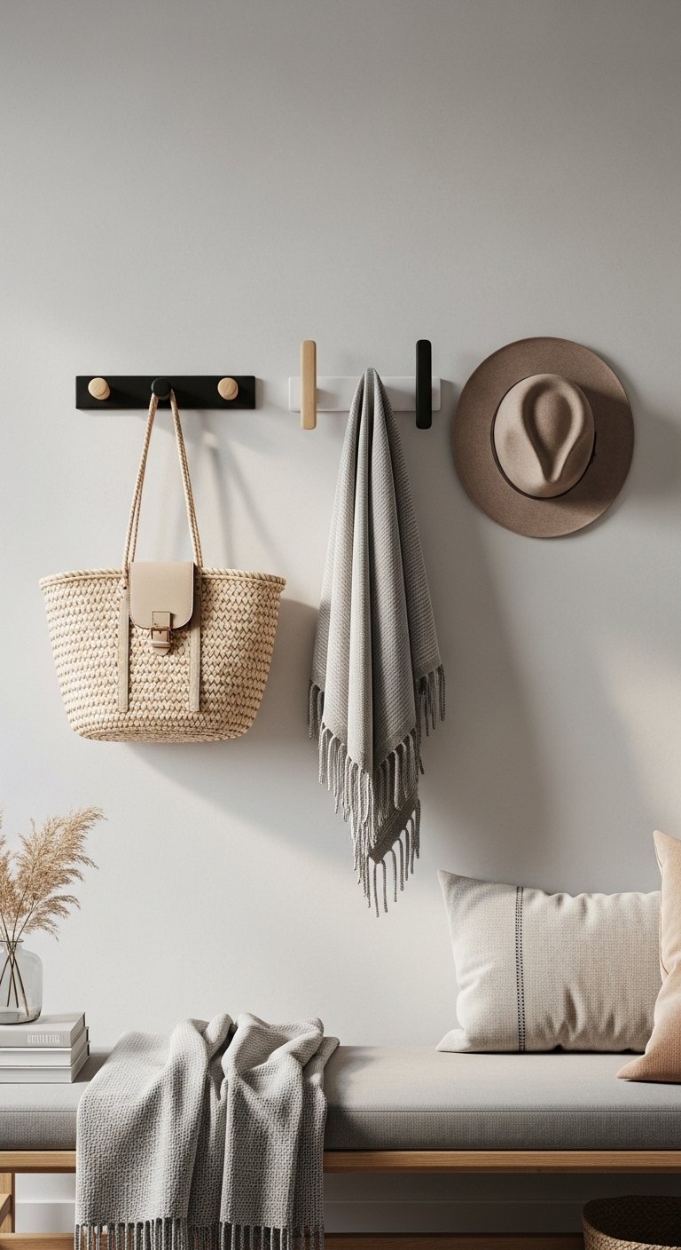 Wall hooks are not just for storage. They can also be part of your decor. Install a few stylish hooks on an empty wall.Hang light items like a woven bag, a hat, or a soft throw. Choose hooks in wood or matte black for a modern touch.Arrange them in a neat pattern for a clean look. This idea saves space and adds a unique design element. It is simple, useful, and visually appealing.