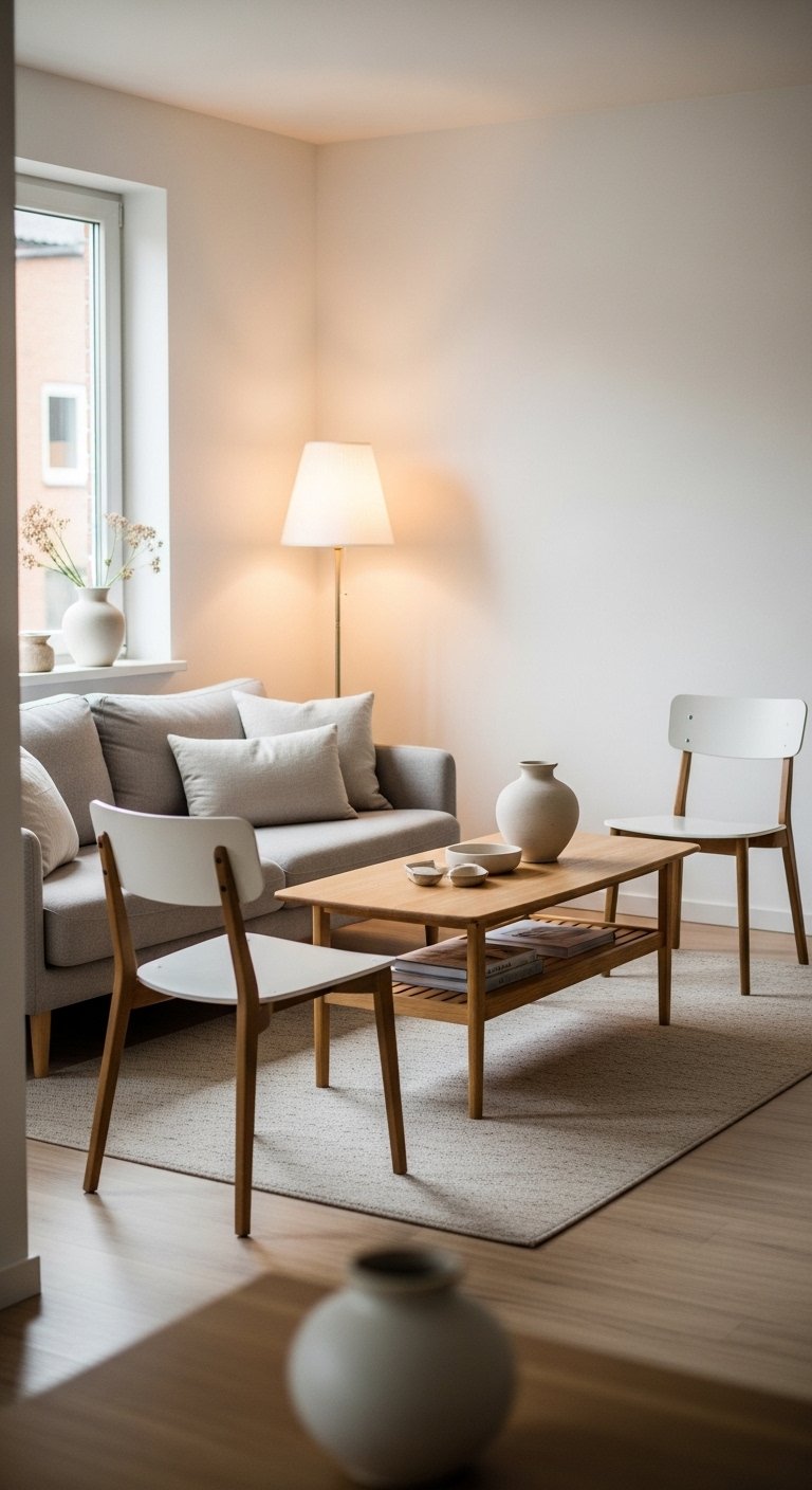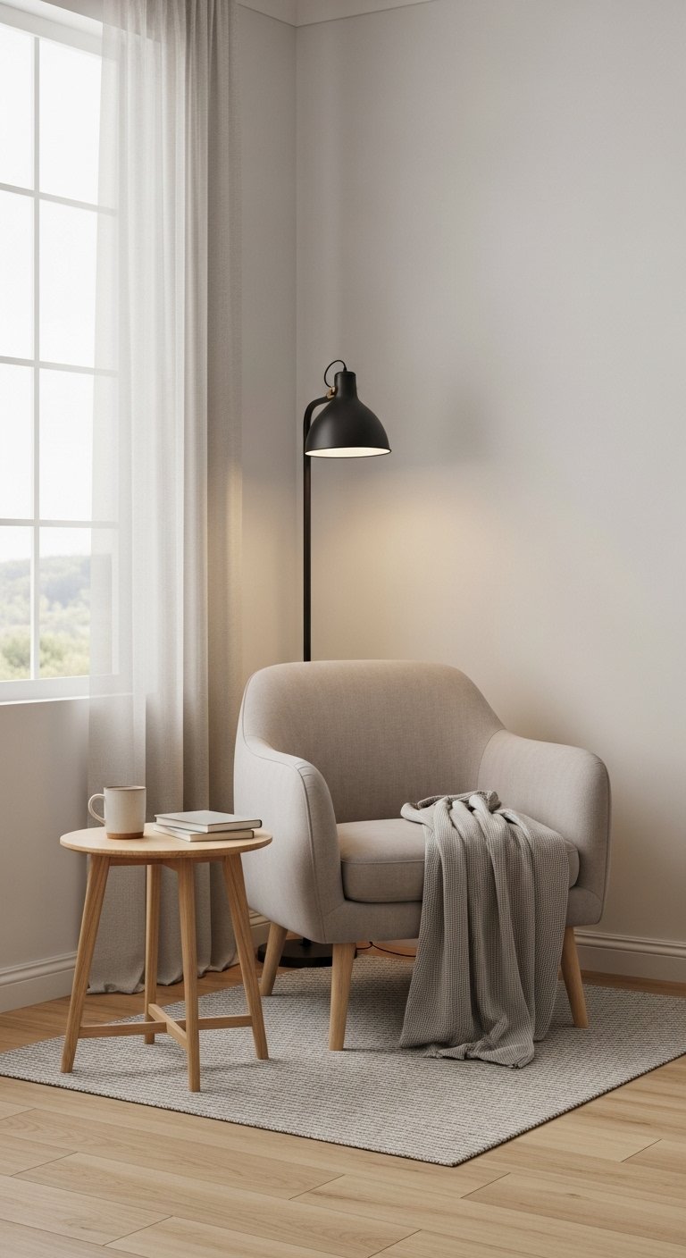 Turn an empty corner into a cozy feature spot. Add a comfortable chair, a small side table, and a soft lamp. This creates a mini reading or relaxing area inside your living room.Use a textured rug under the chair to define the space. Add a small plant or a stack of books for a personal touch.Keep the colors soft and calming to match the rest of the room. This corner adds function and beauty without taking much space or money. It also makes your living room feel more complete and thoughtfully designed.