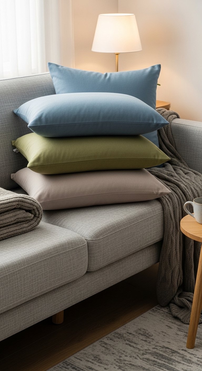 Throw pillows are one of the easiest ways to refresh your space. Choose colors that feel modern but warm, like dusty blue, olive green, or soft terracotta. Mix two or three shades for depth without making the space feel busy.Play with textures like cotton, linen, or knitted fabric. This adds a cozy and layered look. You do not need to buy new pillows. Simply change the covers for a quick update.Arrange them in groups of three or five for a balanced feel. Place larger pillows at the back and smaller ones in front. This small change can make your sofa look styled and expensive without spending much.
