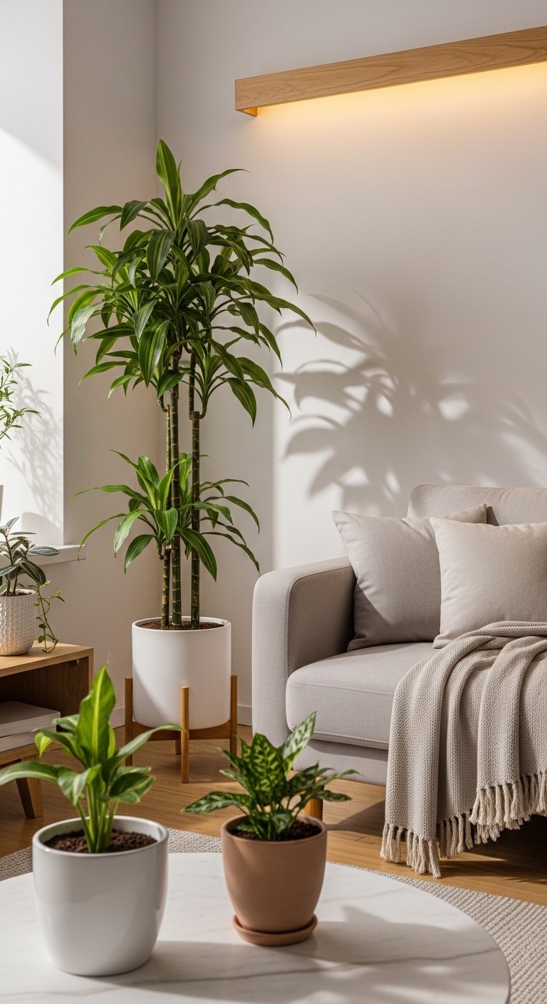 Plants bring life into your living room. Even one or two plants can make a big difference. Choose easy options like snake plants or pothos if you want low maintenance.Place taller plants in corners and smaller ones on shelves or tables. Use simple pots in neutral colors like white, beige, or clay. This keeps the look clean and modern.Greenery adds color, texture, and a natural feel. It also makes the space feel calm and fresh. This is one of the most affordable ways to upgrade your room instantly.