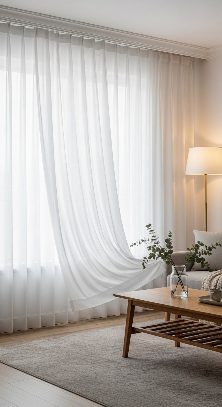 Heavy curtains can make a room feel dark and small. Switch to light fabrics like sheer or linen for a fresh look. Soft white, cream, or pastel shades work best.Hang curtains higher than the window to make the ceiling look taller. Let them fall slightly onto the floor for a soft and elegant touch.Natural light should flow easily into the room. This creates a bright and open feel. Light curtains can completely change the mood of your living room without a big cost.