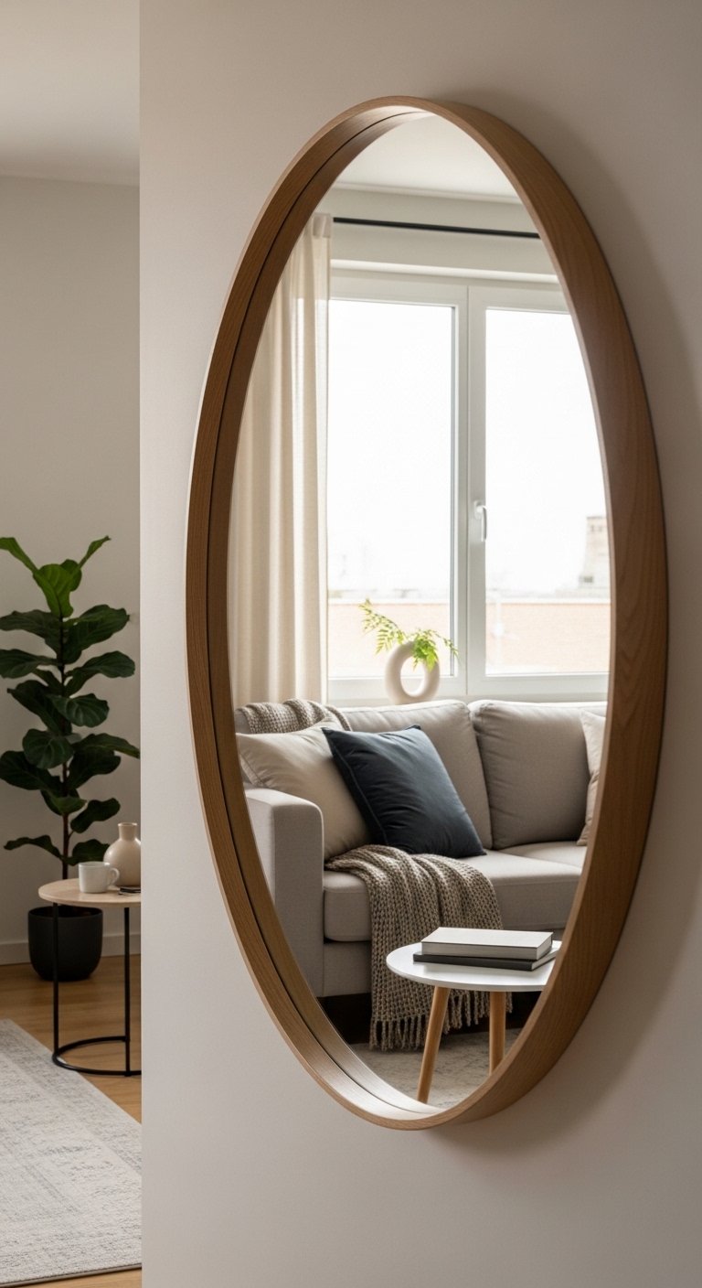Mirrors reflect light and make your living room feel more open. Place a large mirror opposite a window to bounce natural light across the room.Choose simple frames in wood or metal for a clean look. Round mirrors add softness, while rectangular ones feel modern.You can also create a small mirror arrangement on one wall for a stylish effect. This trick works well in small spaces and instantly makes the room feel brighter and larger.