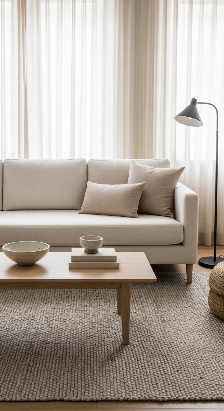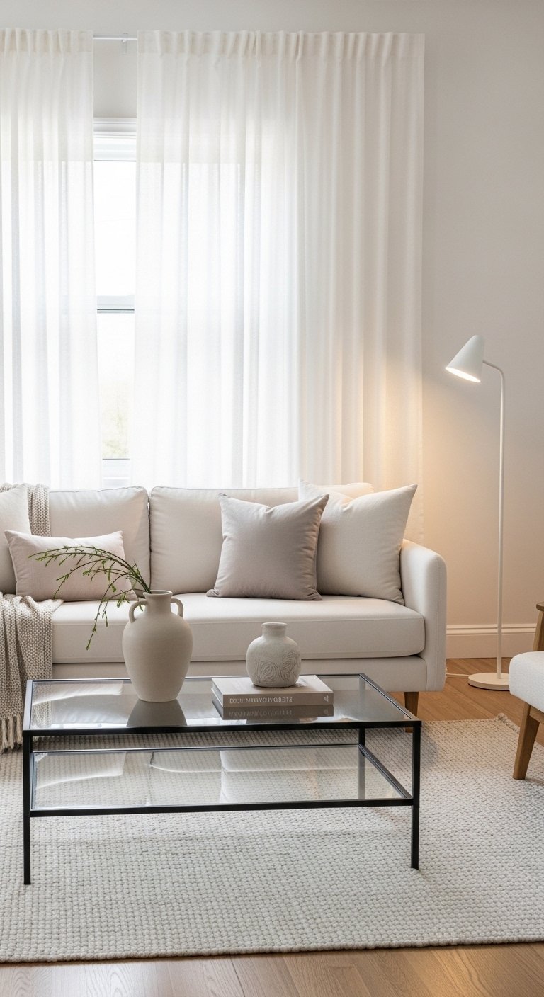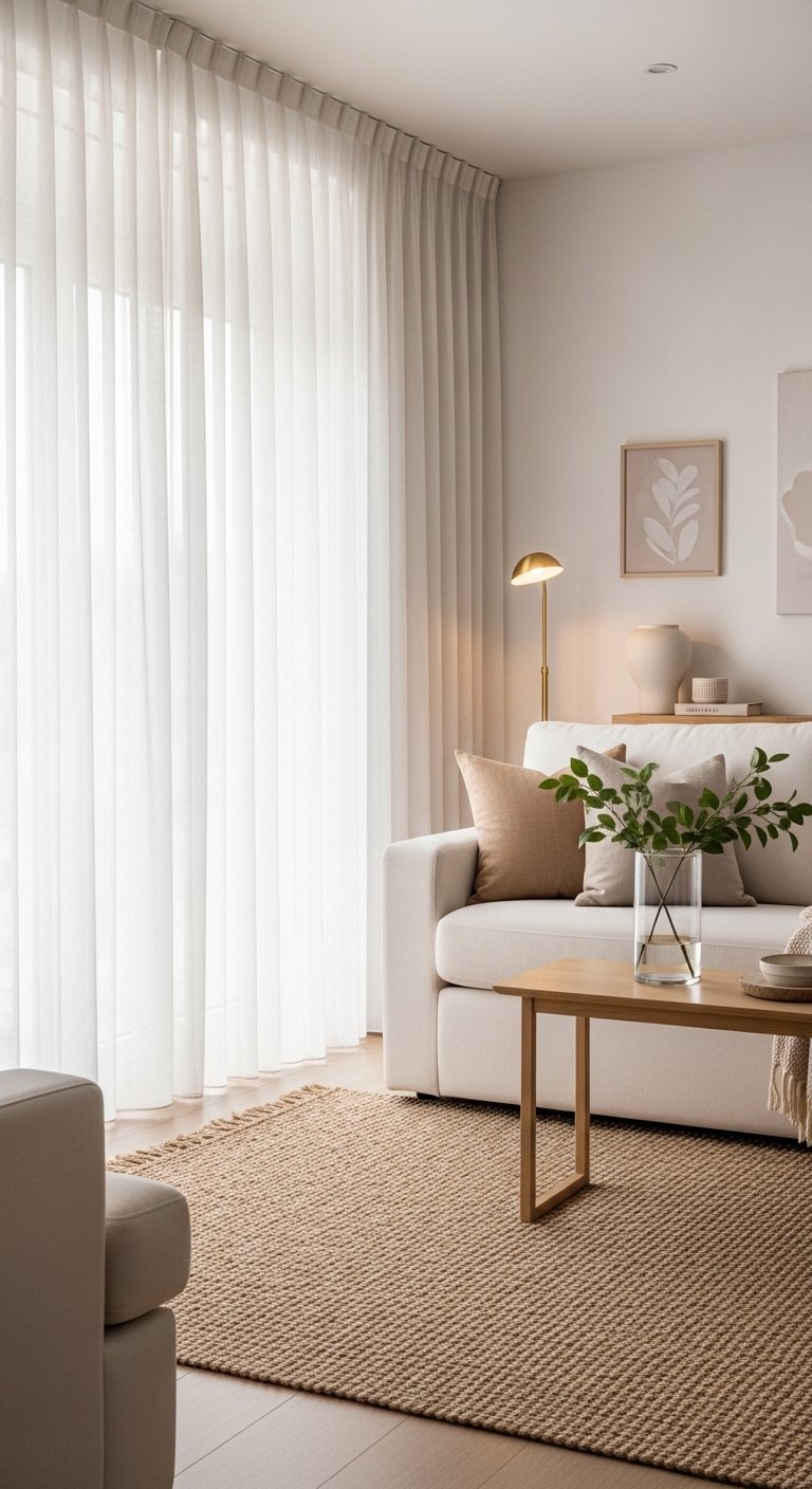22. Cream Sofa with Sheer Curtains and Bright Airy Layout