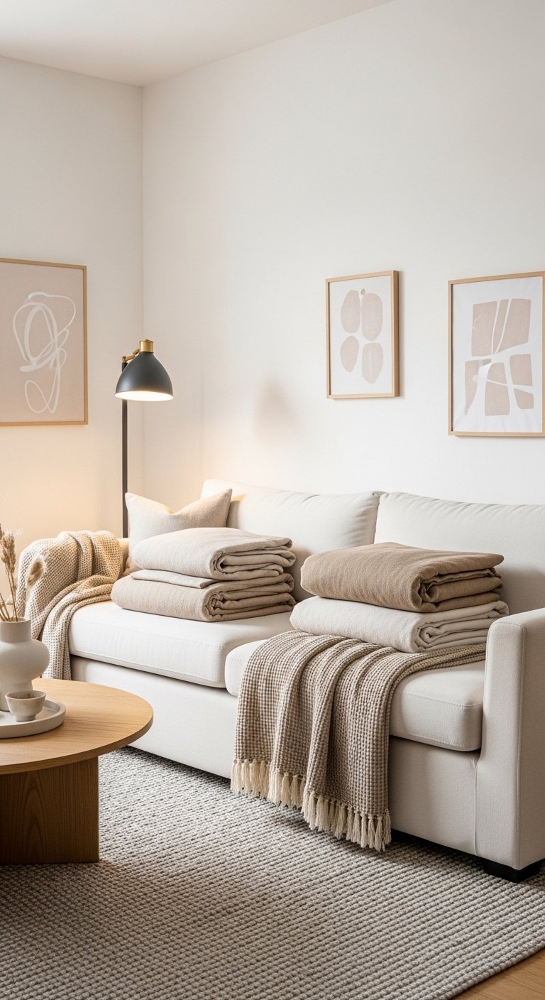 14. Cream Sofa with Layered Throws for Soft Dimension